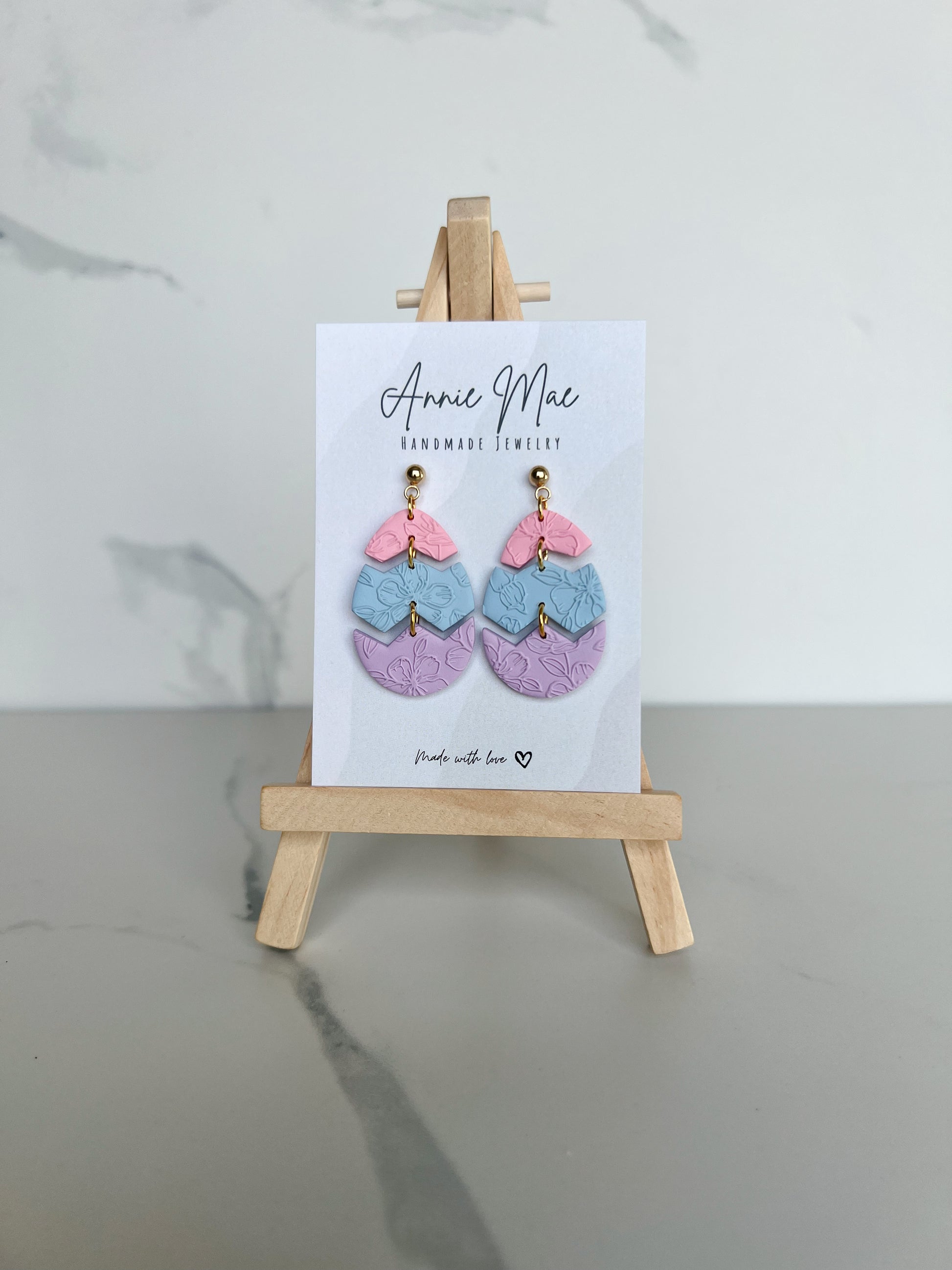 3 Seperate egg pieces in pink, blue, and purple. All with a beautiful floral texture and hanging from a gold ball post.