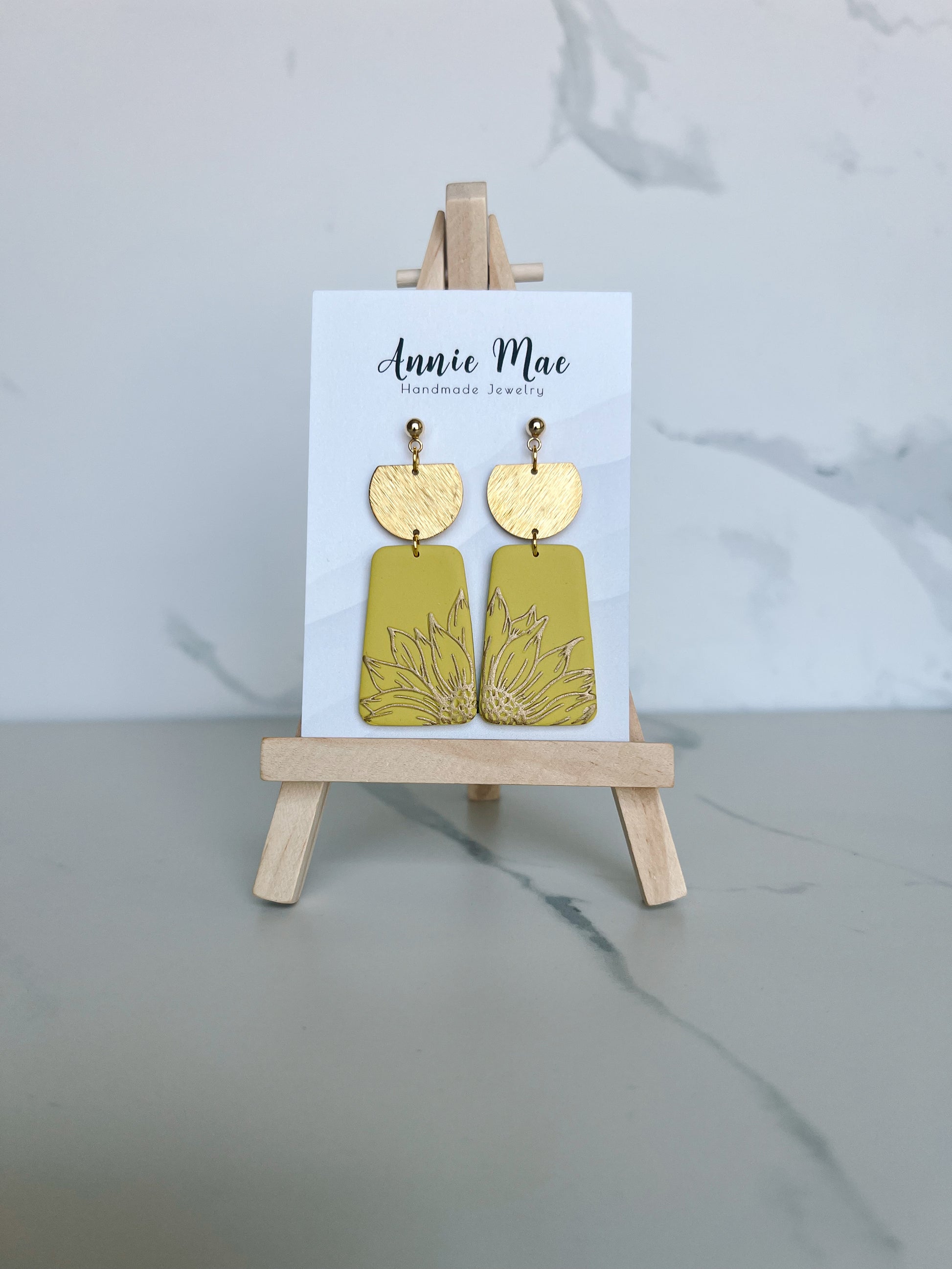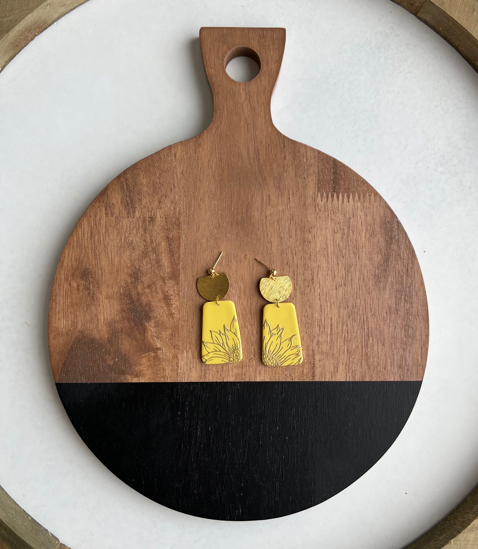 Beautiful sunflower yellow with a sunflower embossed pattern that is painted in gold. Hanging from a brass/gold charm and gold post.