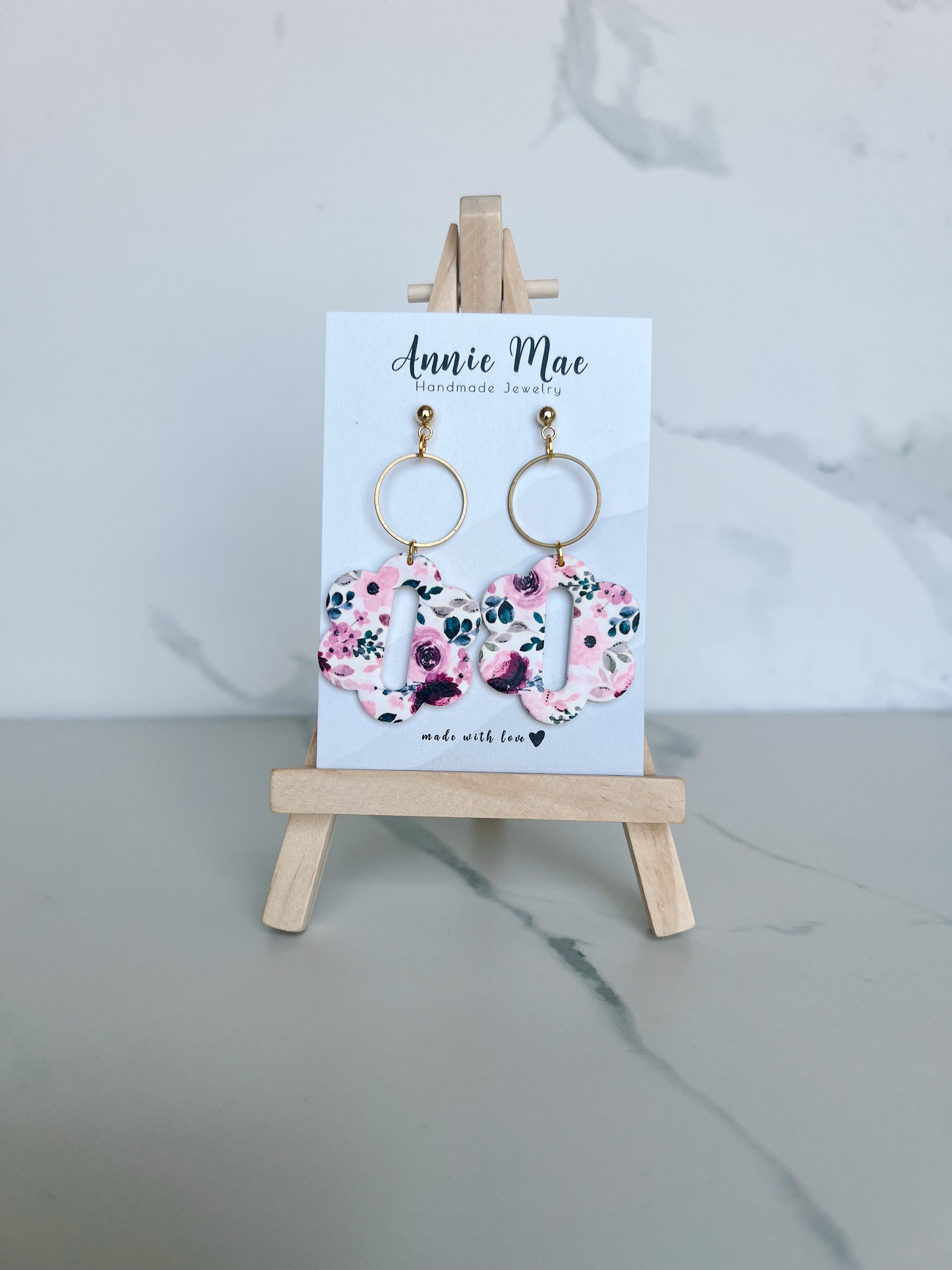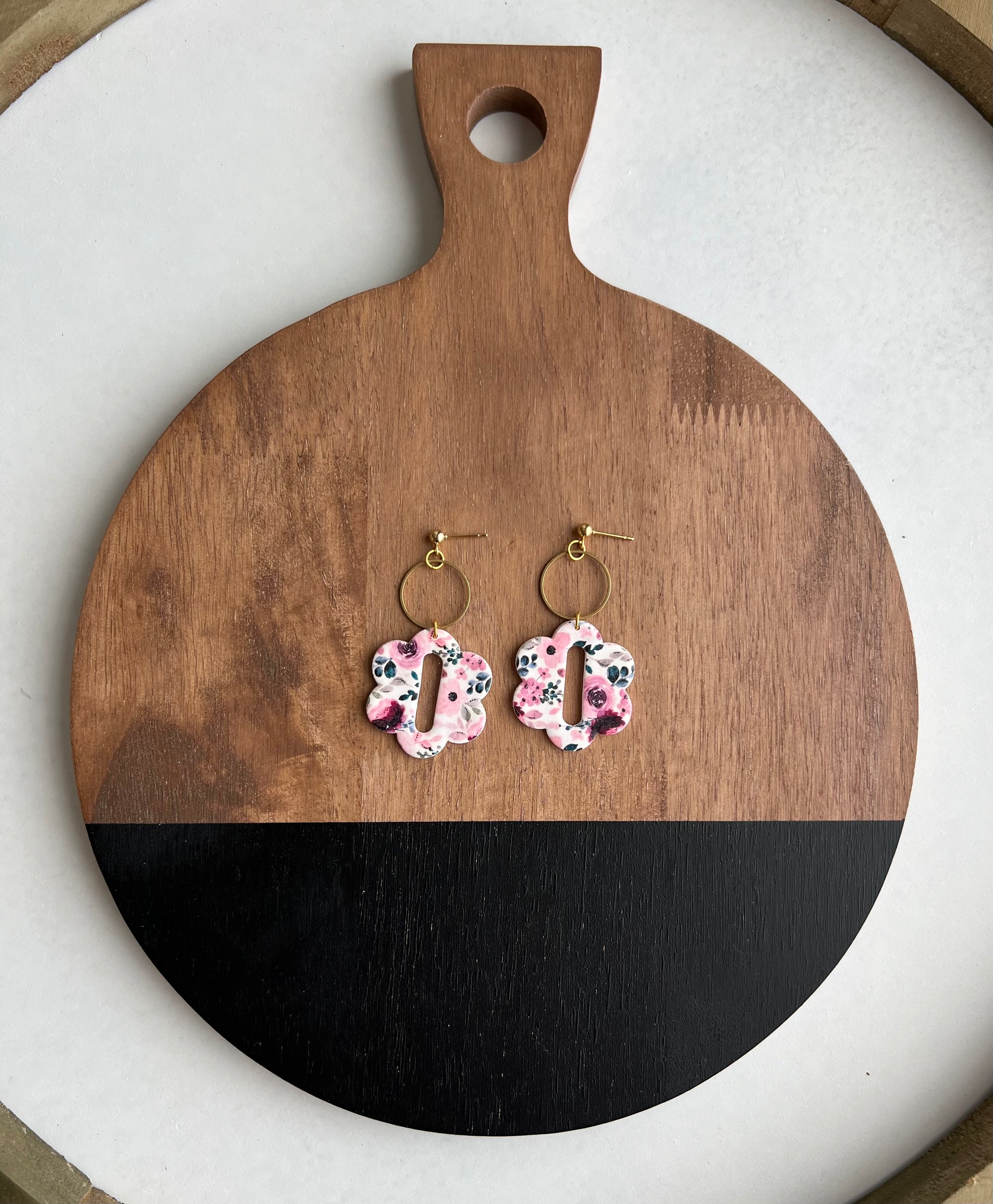 Flower cut out shape in a pretty floral pattern. Hanging from a brass circle and then a gold post.