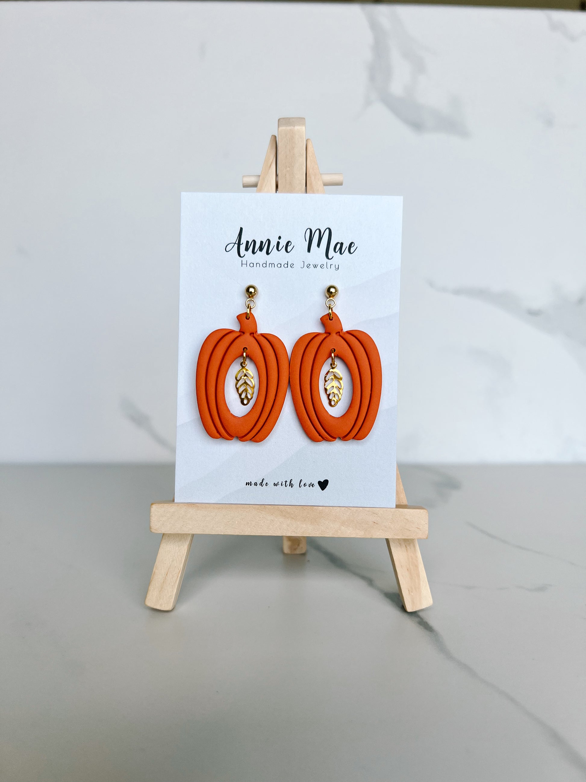 A Pumpkin donut shape with embossing and a gold leaf charm hanging in the middle. These can also be done in silver and any color of clay you would like. If you want a different color, please contact me before ordering!