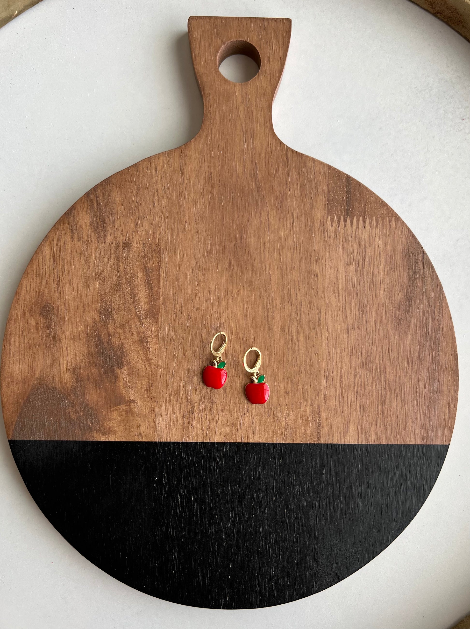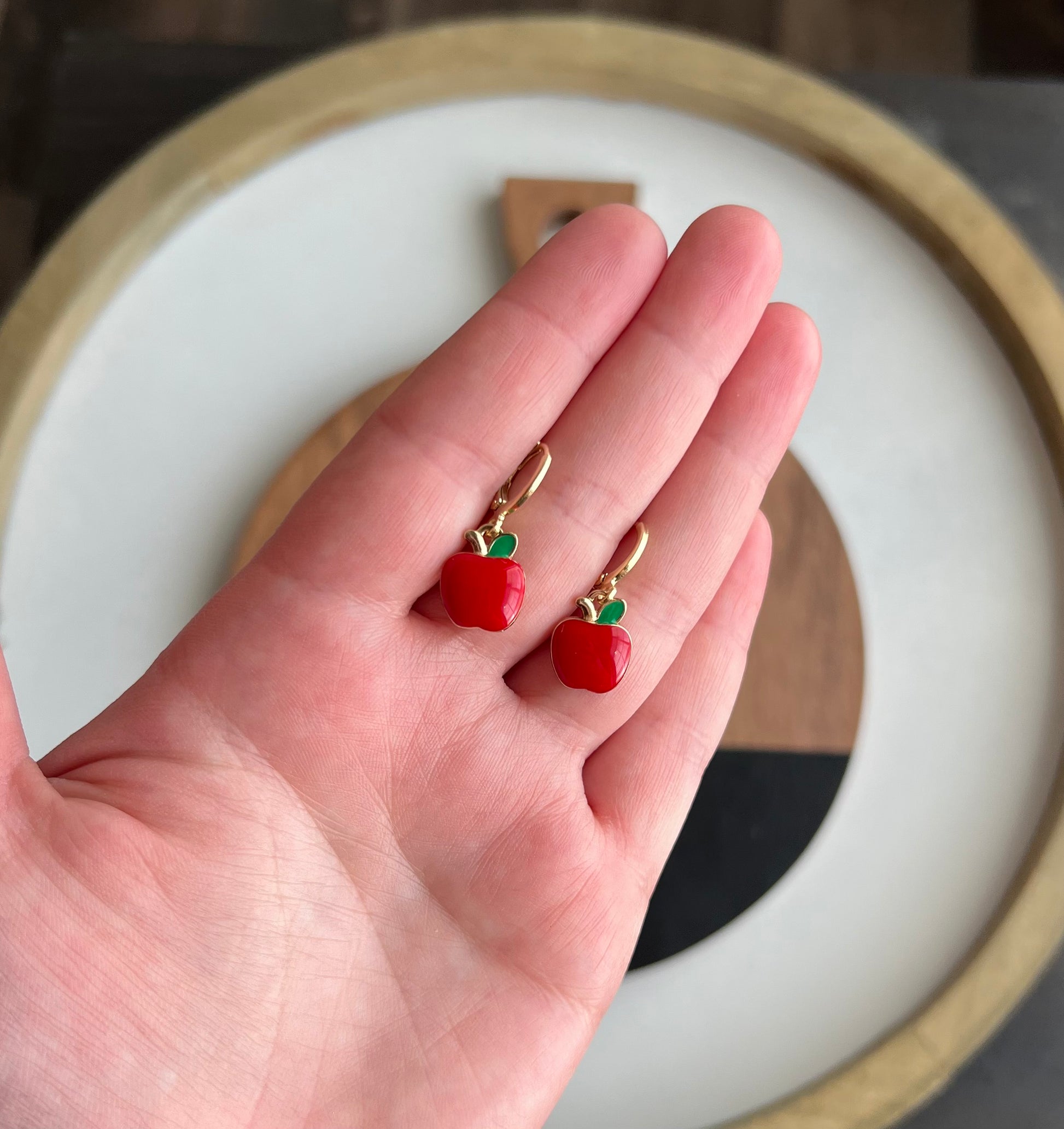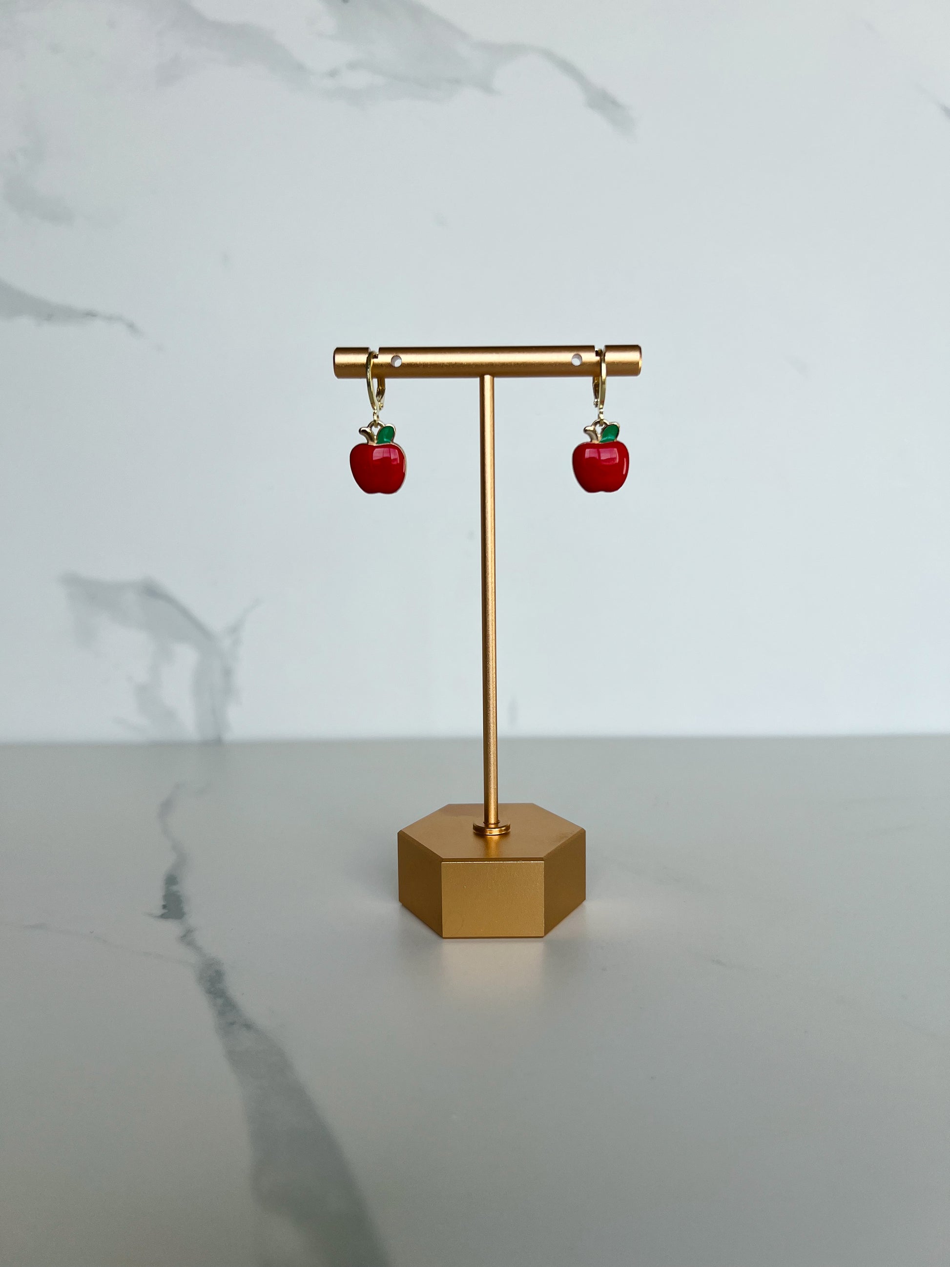 Cute metal red apples with green leaves hanging from a gold huggie hoops.