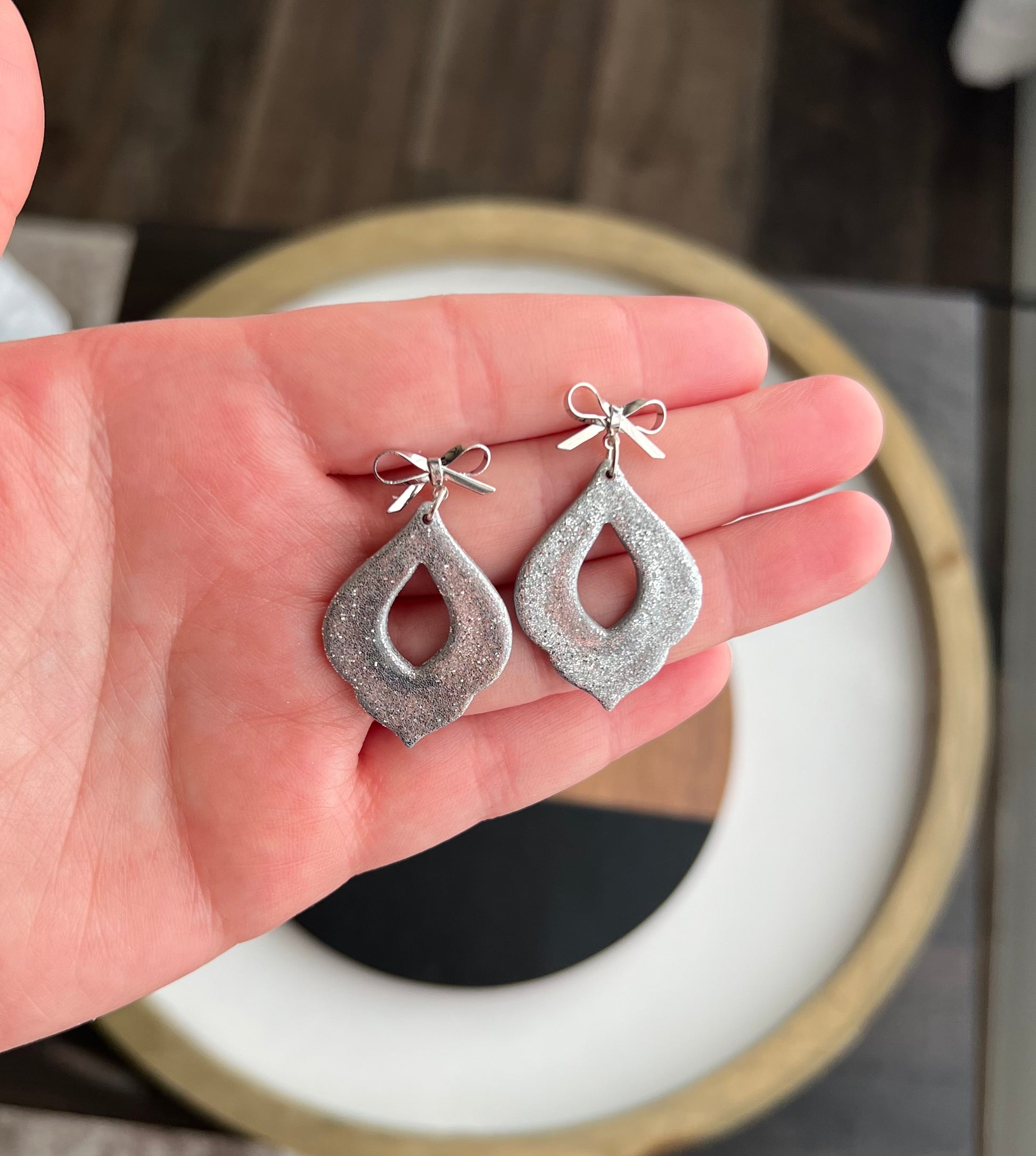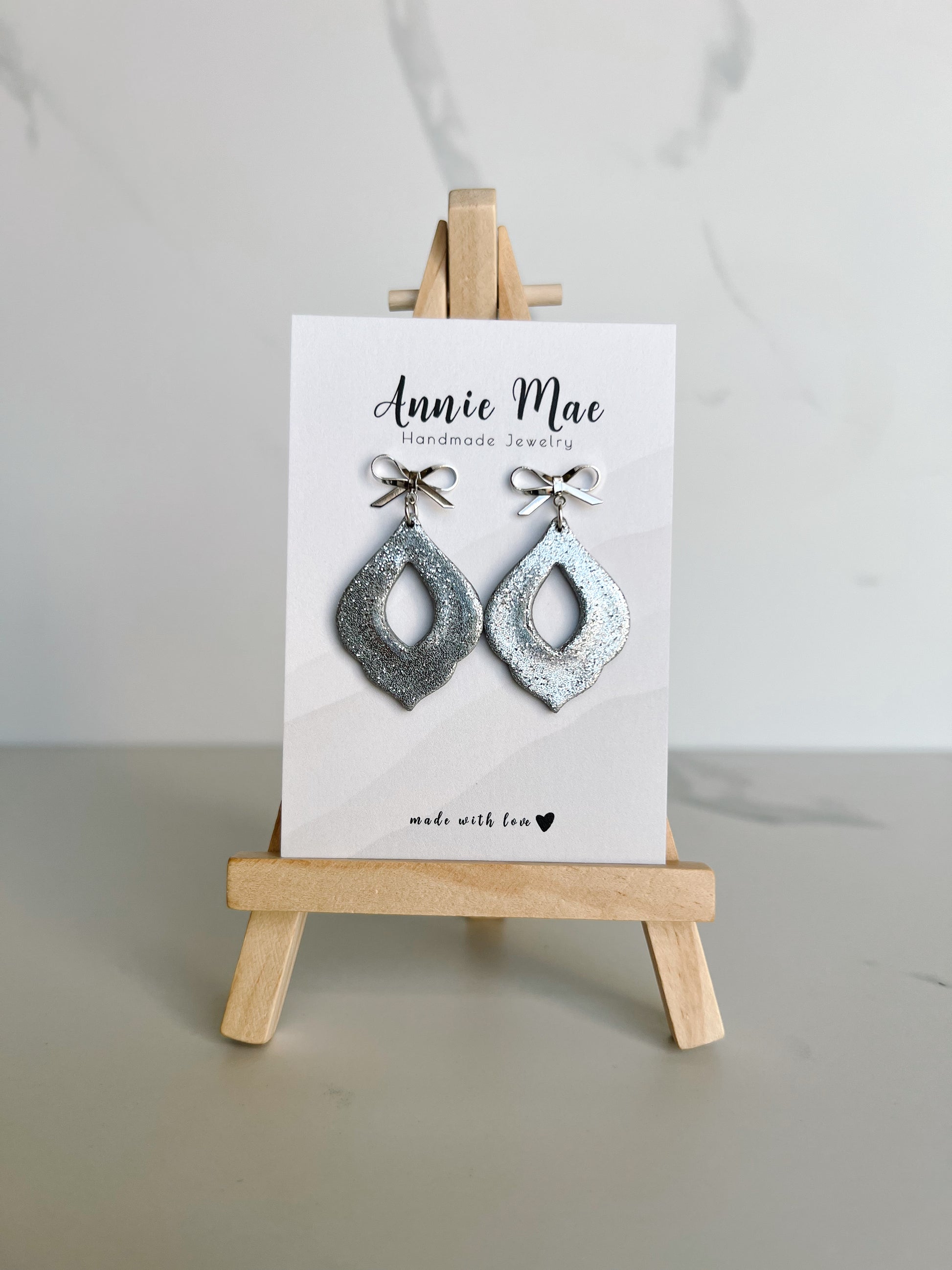A pretty ornament style shape in a shiny silver glitter, sealed in resin so they are really shiny! Hanging from a cute bow post.