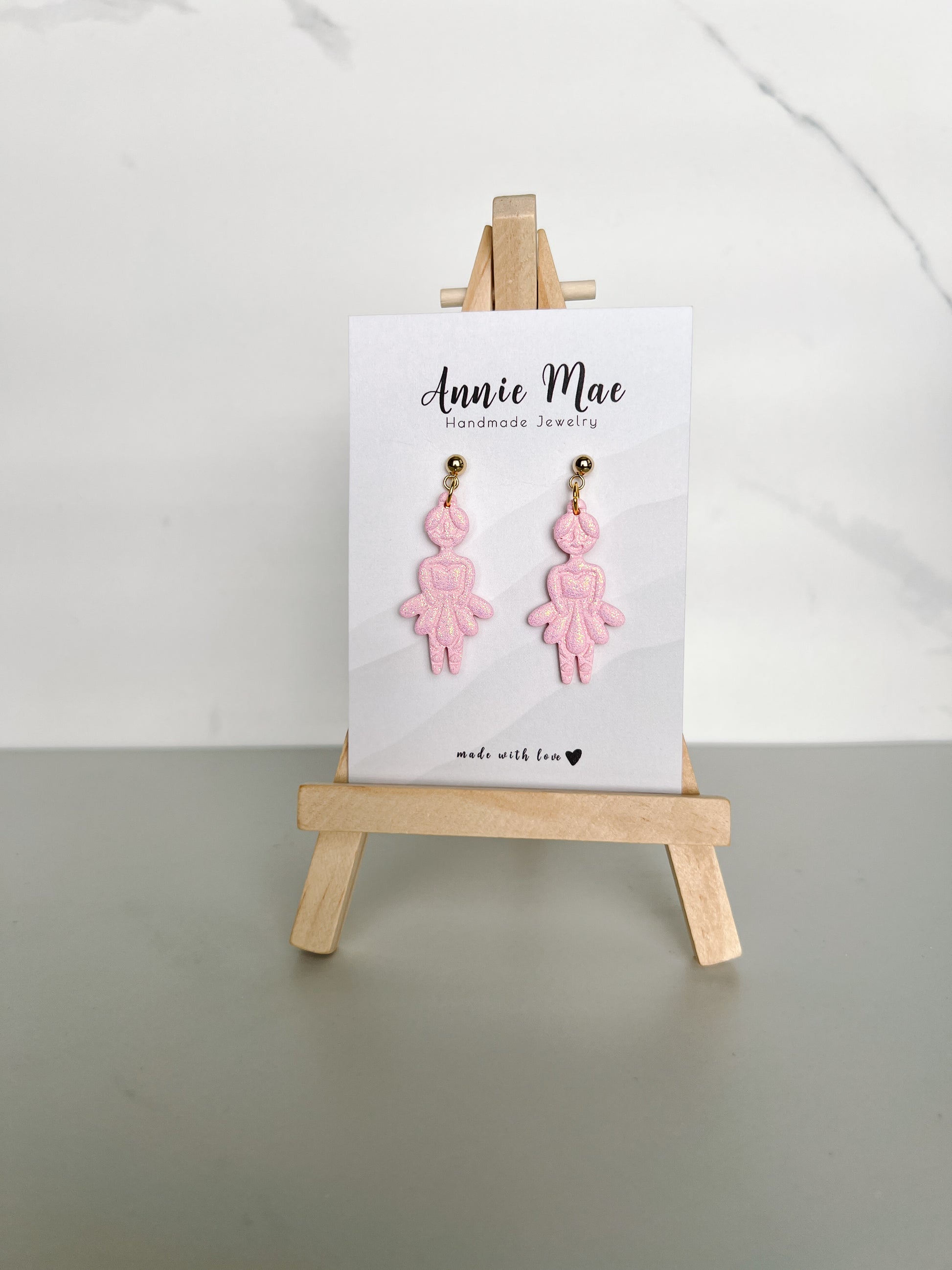 Pink glitter ballerinas. Gold ball post but can also be done with silver.