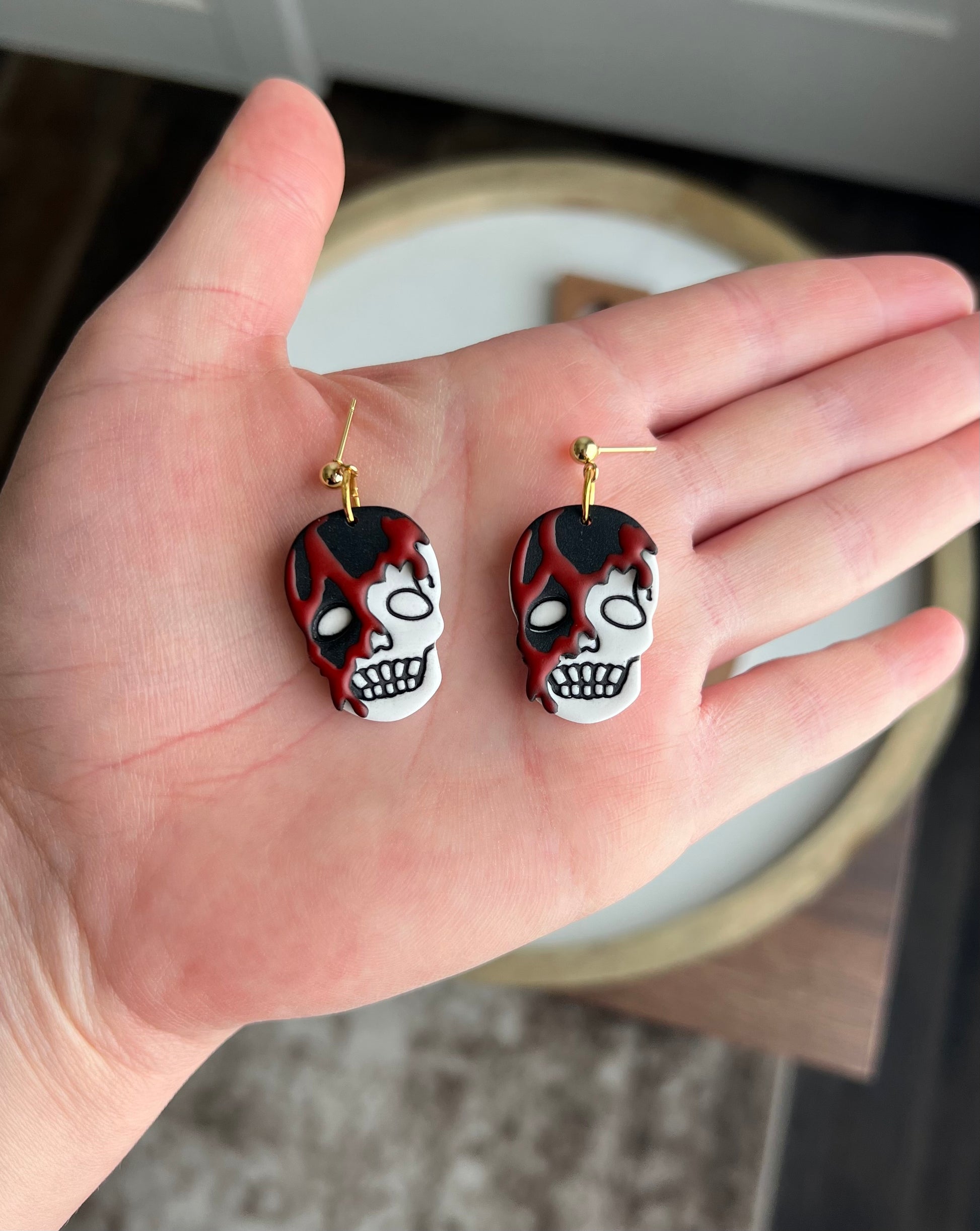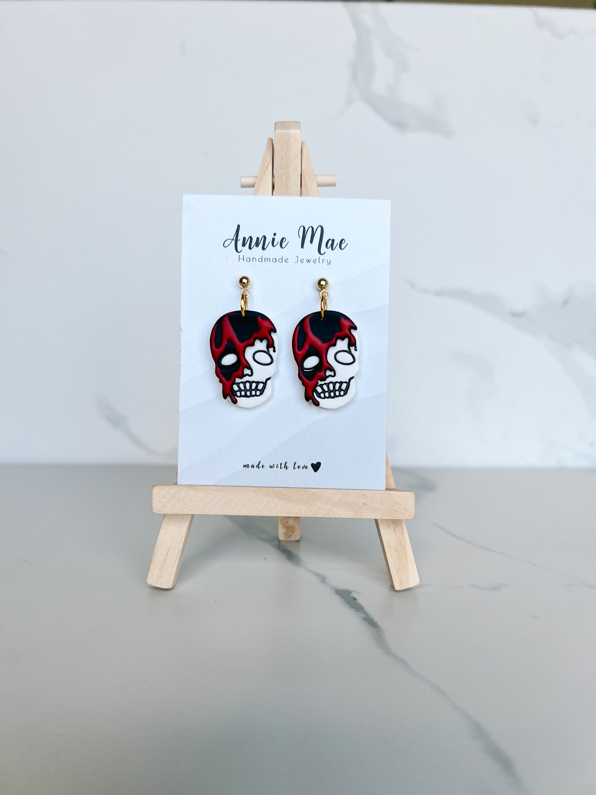 Black and white detailed skeleton with a black mask that’s dripping red “blood”.