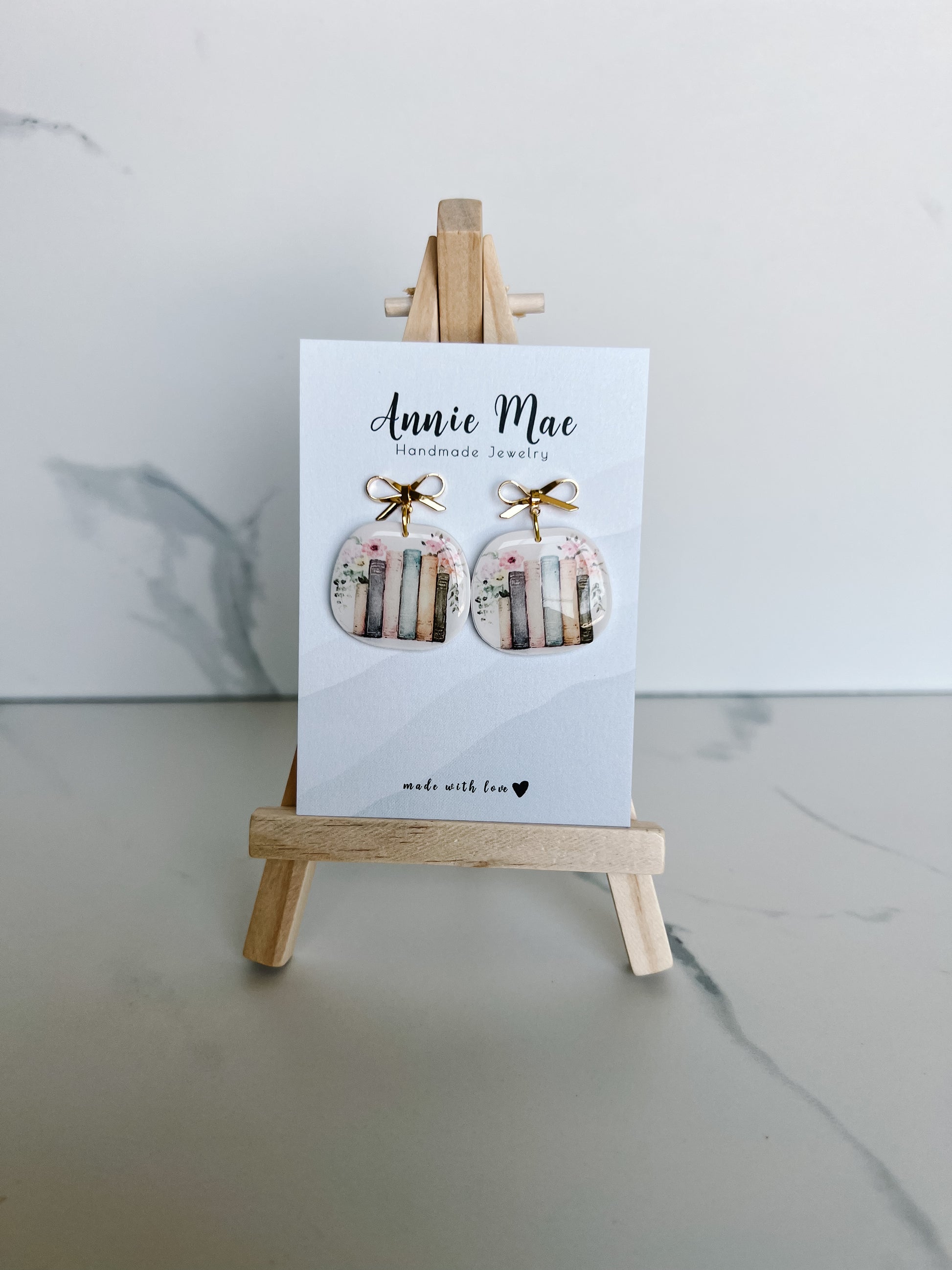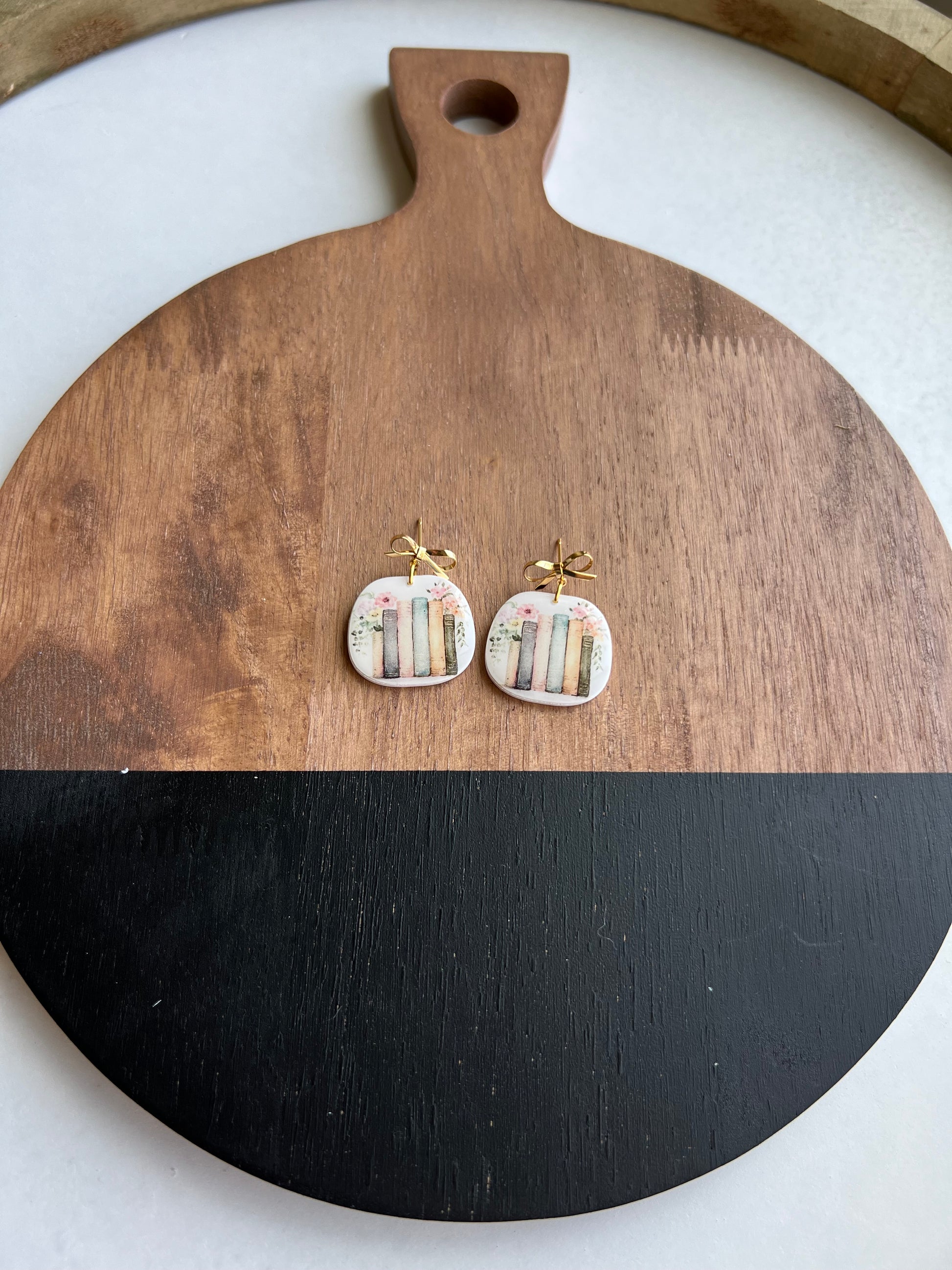 Beautiful book stack design on a white clay background, sealed with resin to give a nice shine. Hanging from a cute silver or gold bow post.