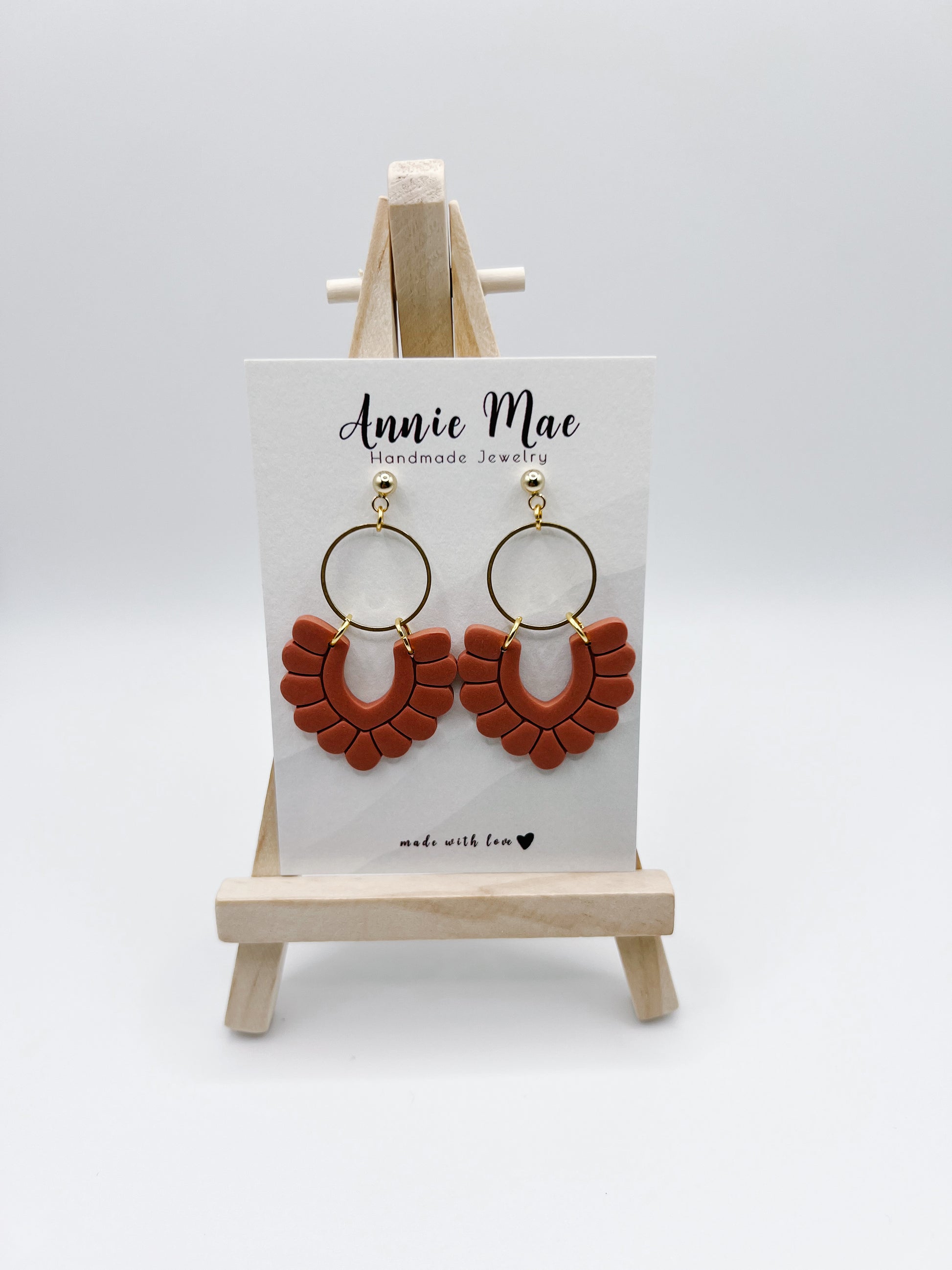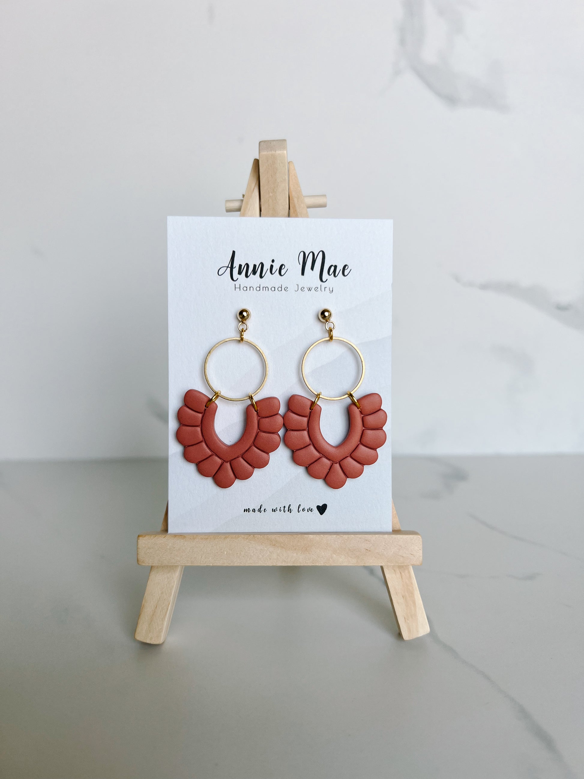 Terra Cotta embossed bubbly V shape hanging from a brass circle.