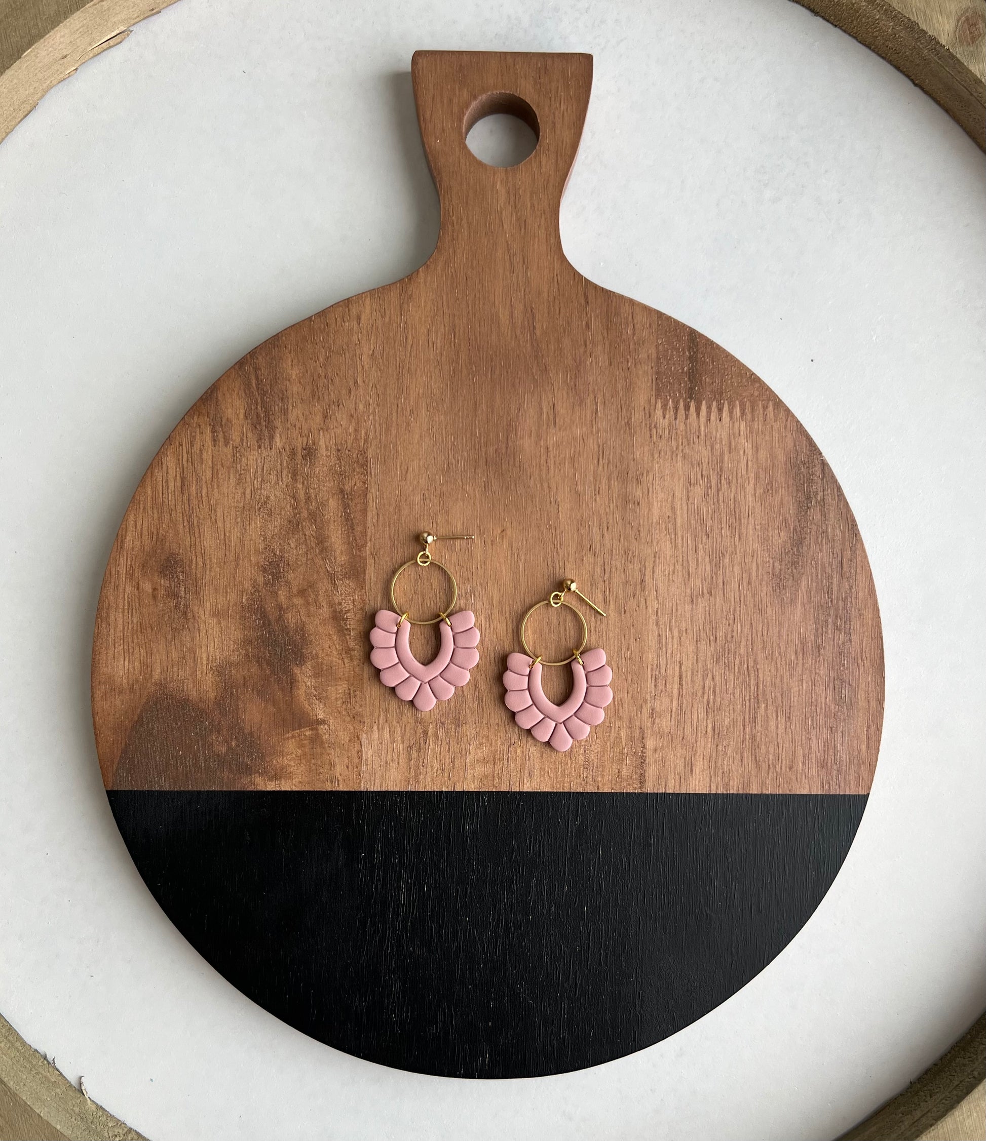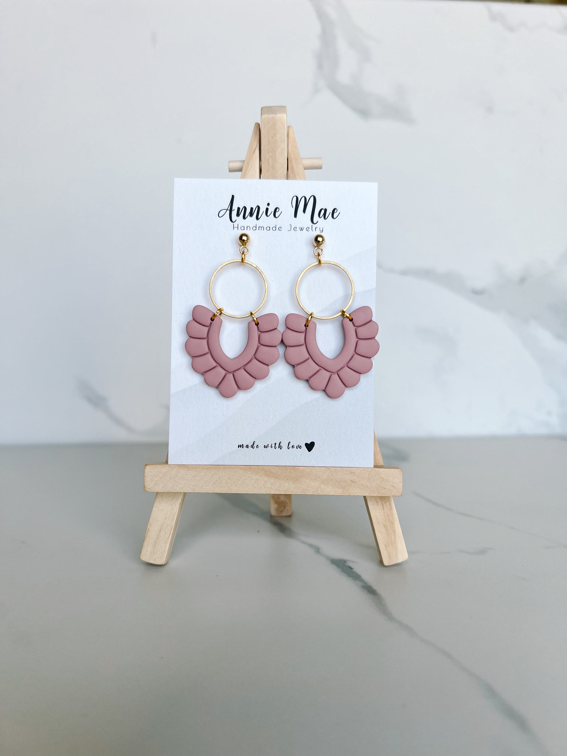 Dusty pink embossed bubbly V shape hanging from a brass circle.
