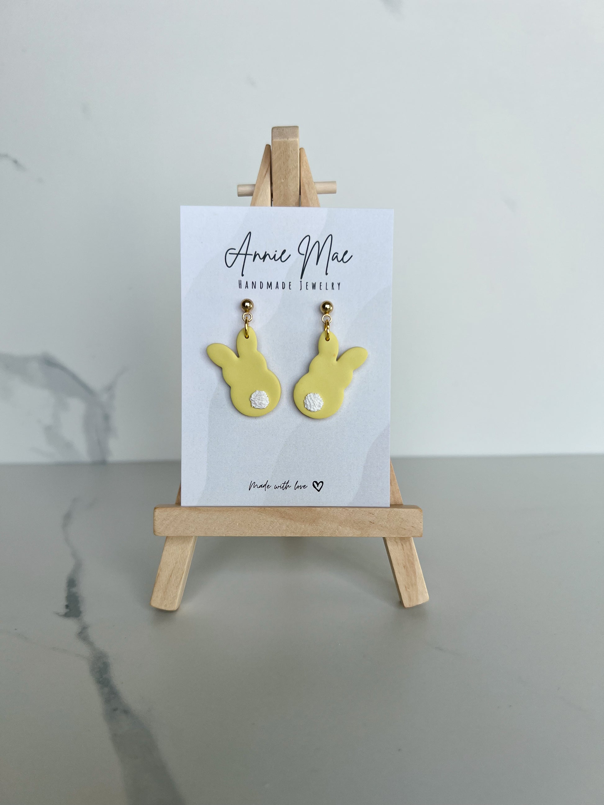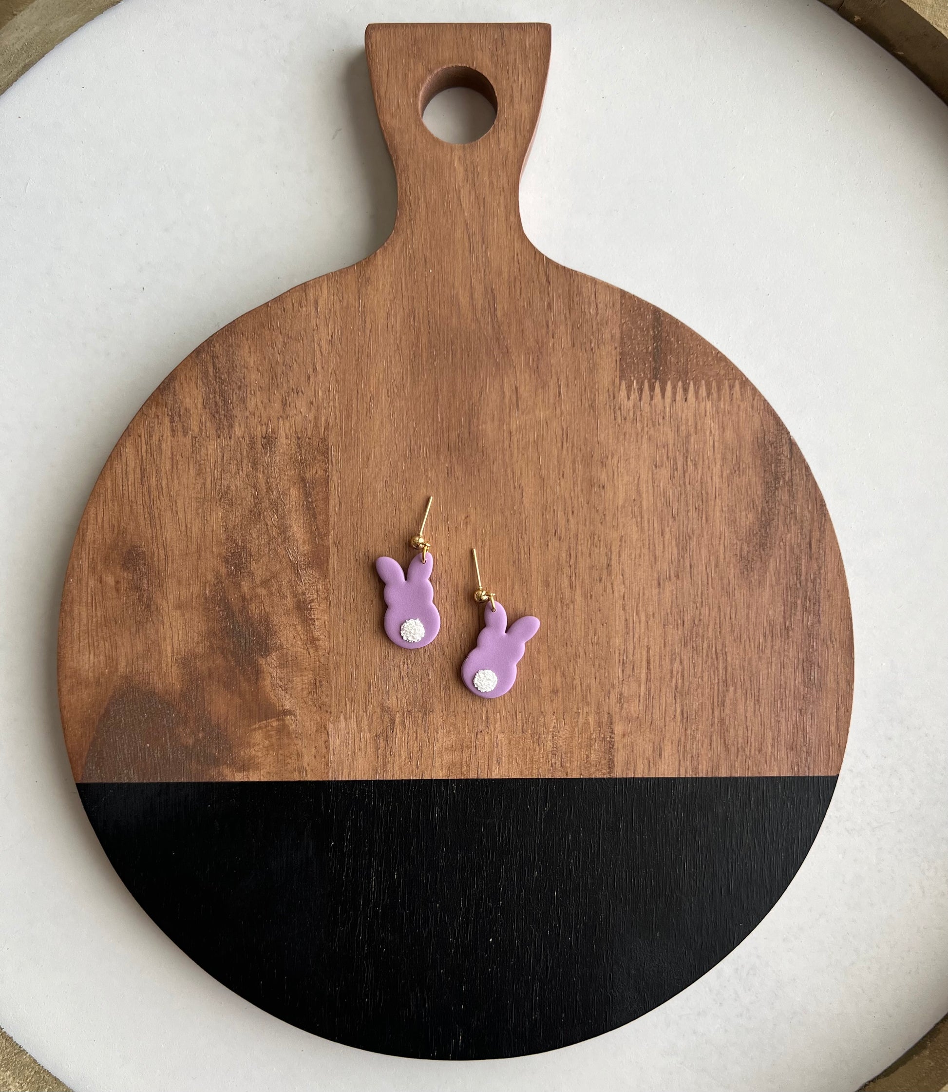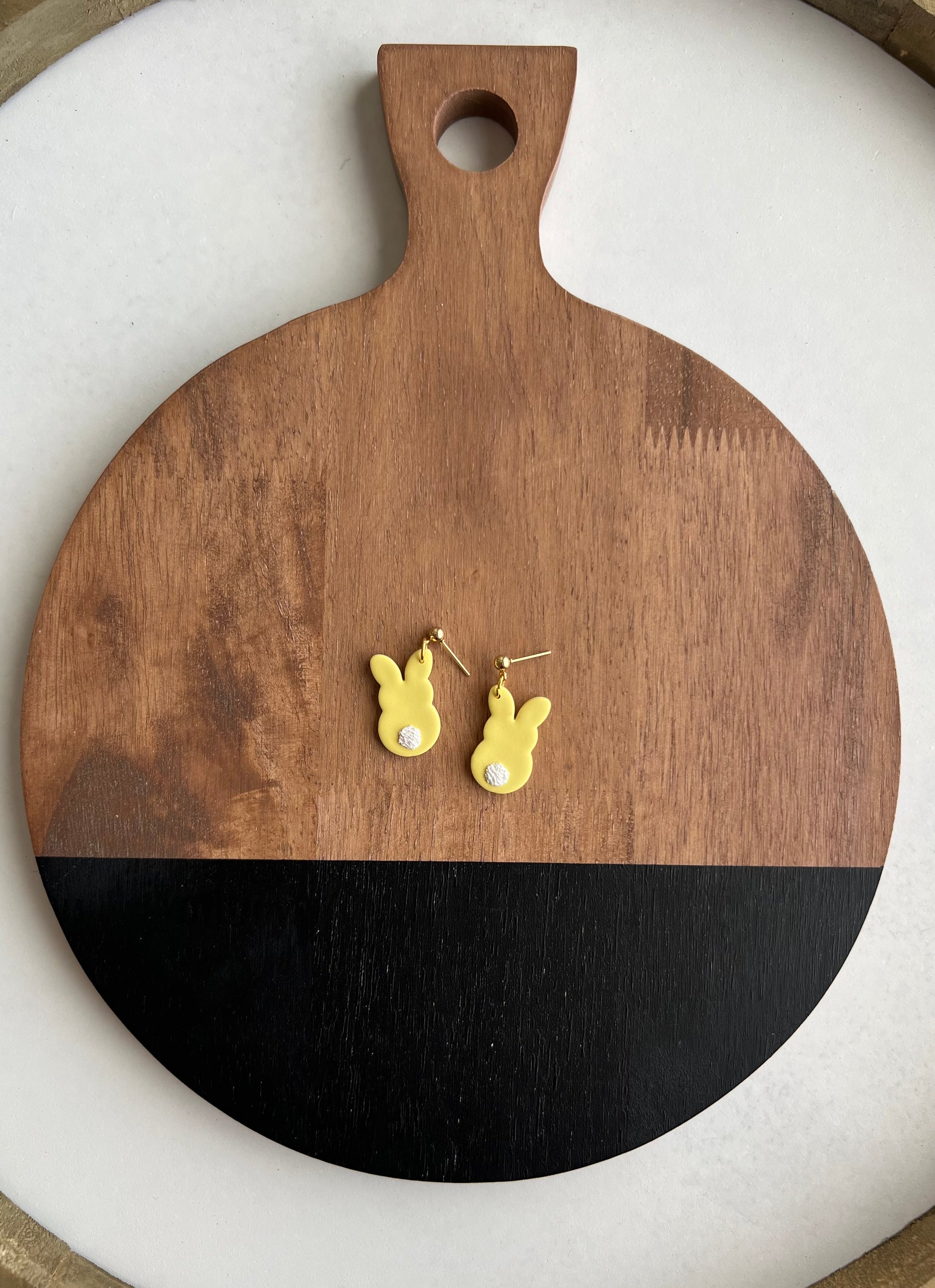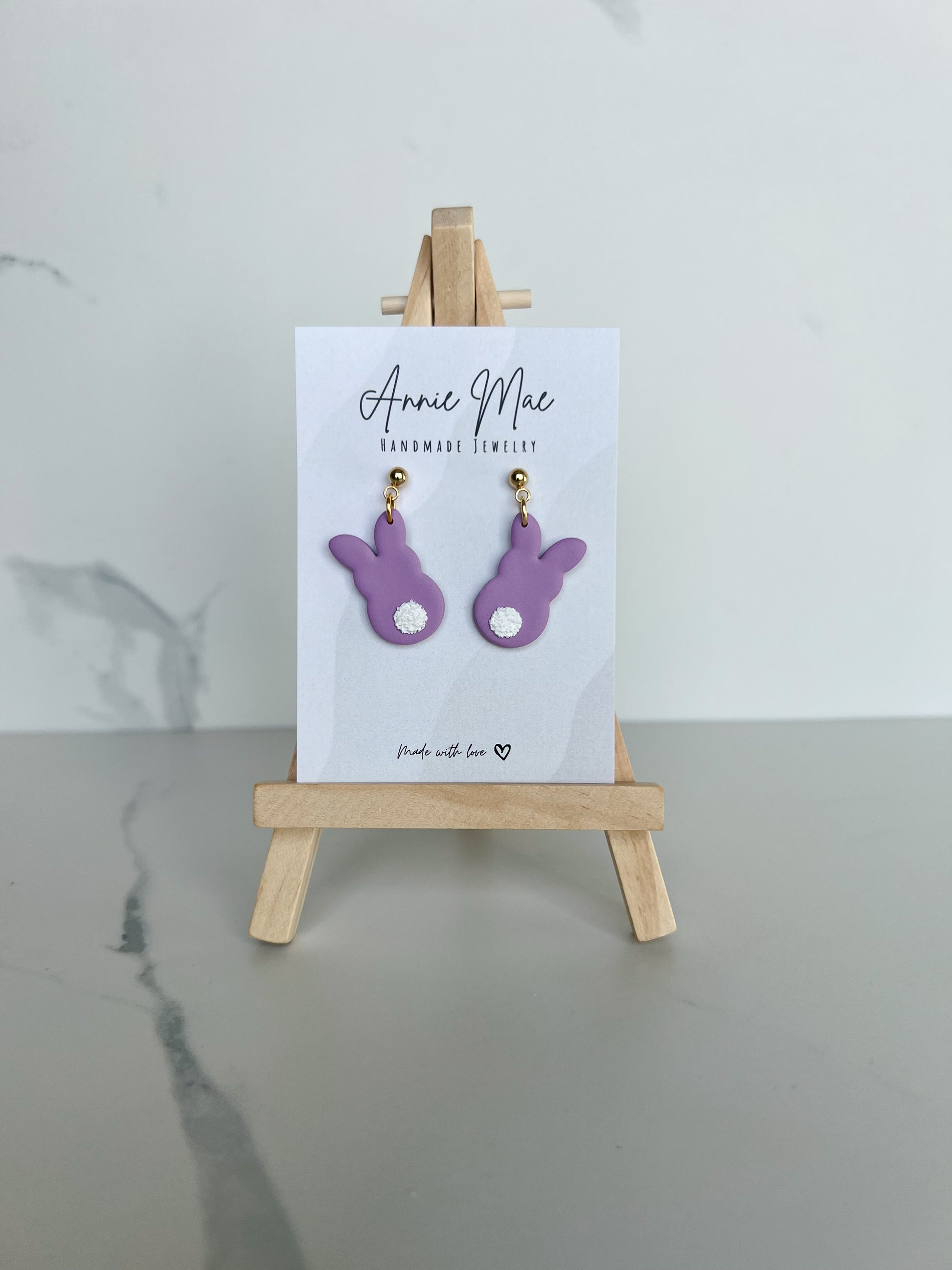 Multiple different options. You can choose either the bunny face or the bunny tail, and there are 4 color options. Hanging from gold ball posts.