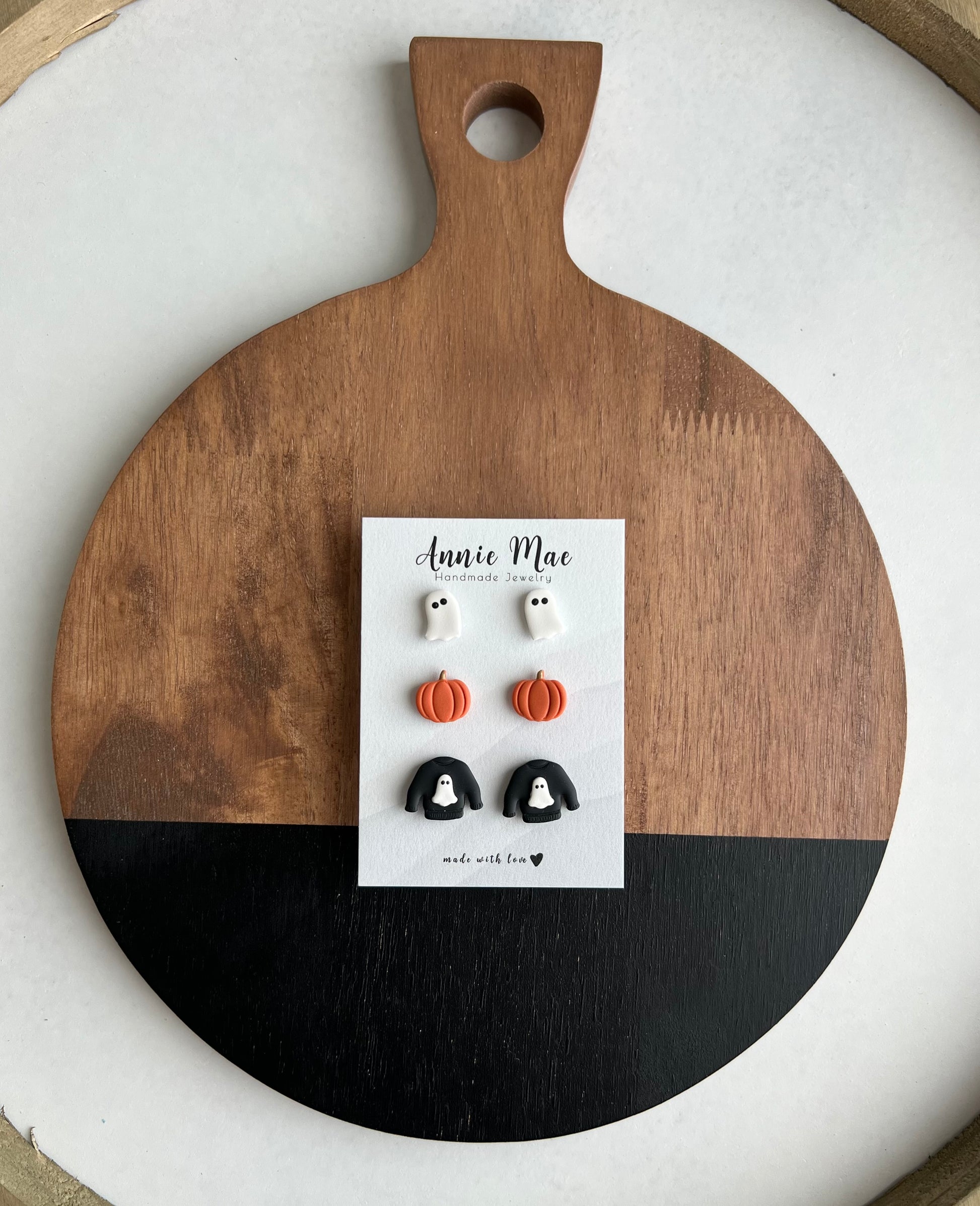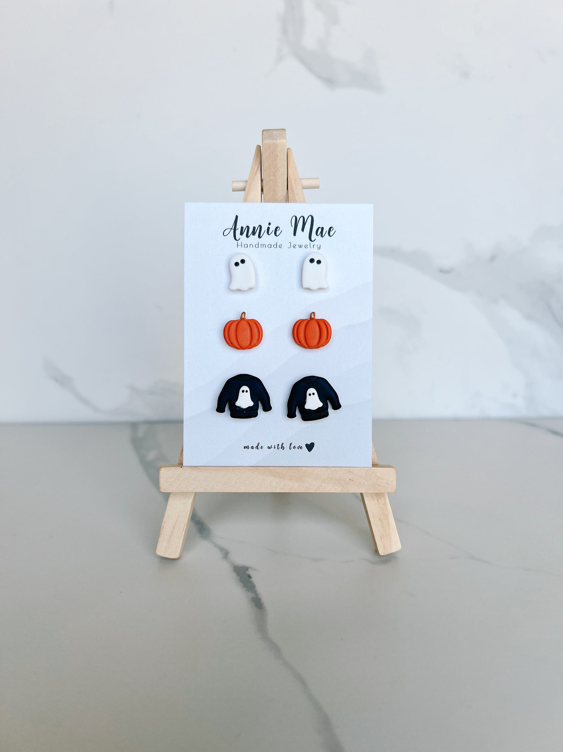 White ghosts, orange pumpkins, and black sweaters with tiny white ghosts.