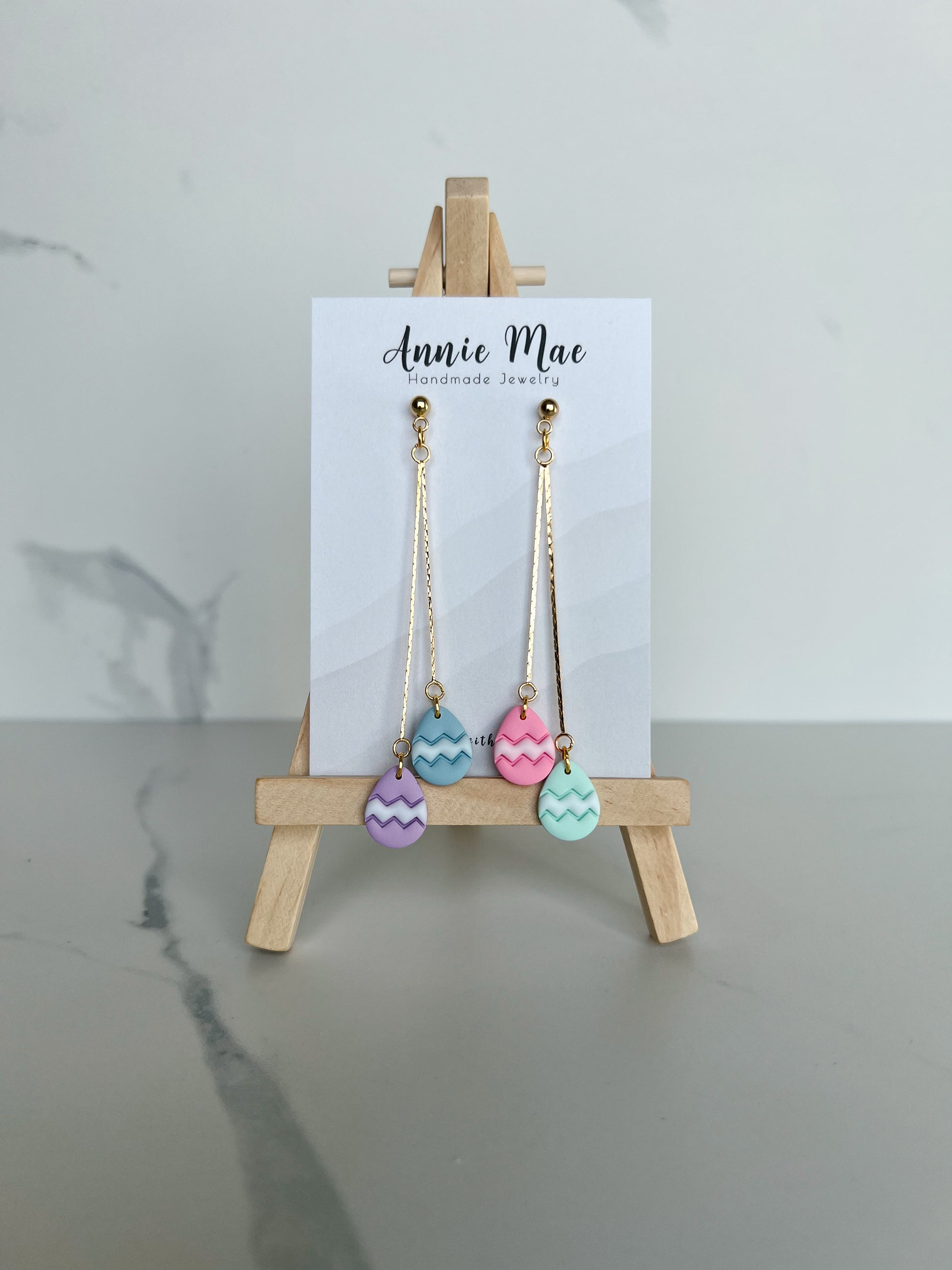 Purple, blue, pink, and mint decorated Easter eggs hanging from gold chains. These can also be done in silver upon request.