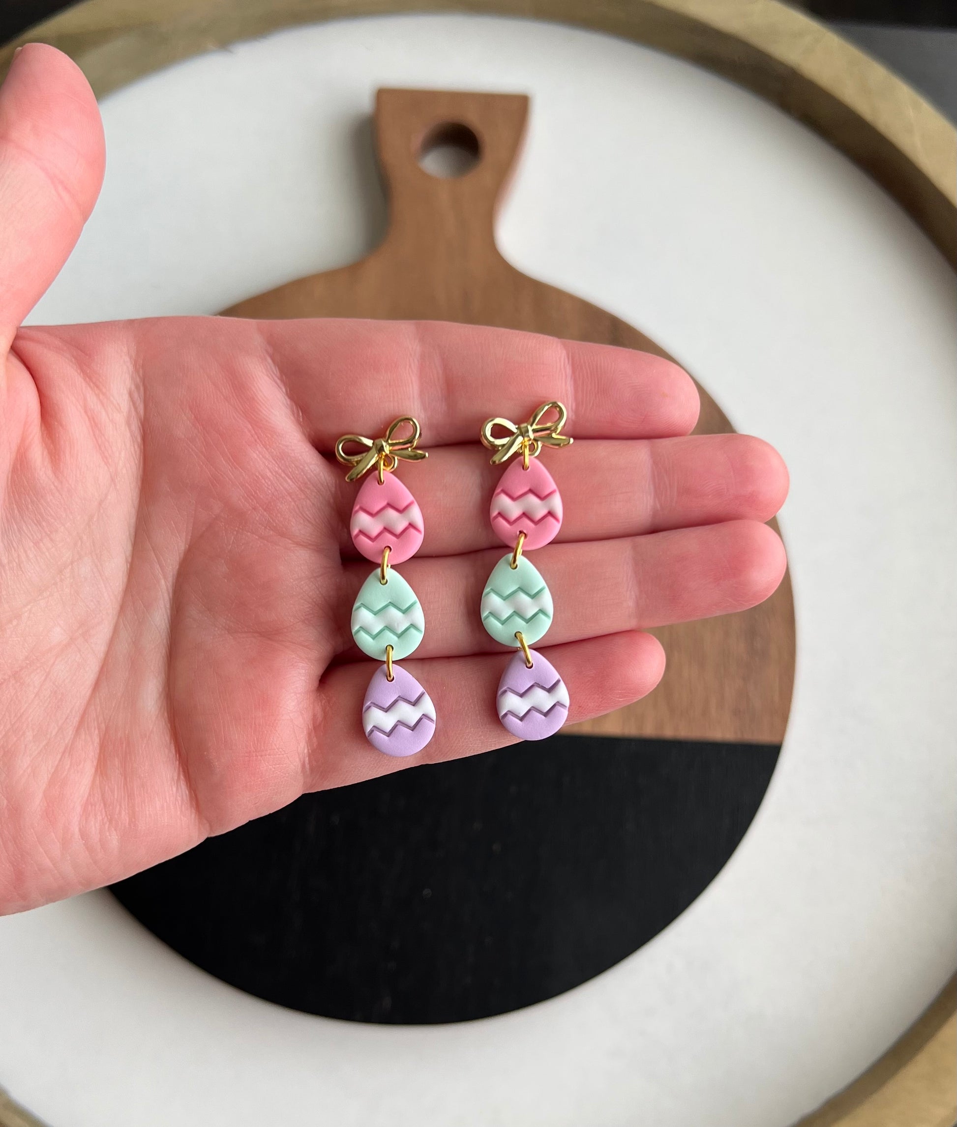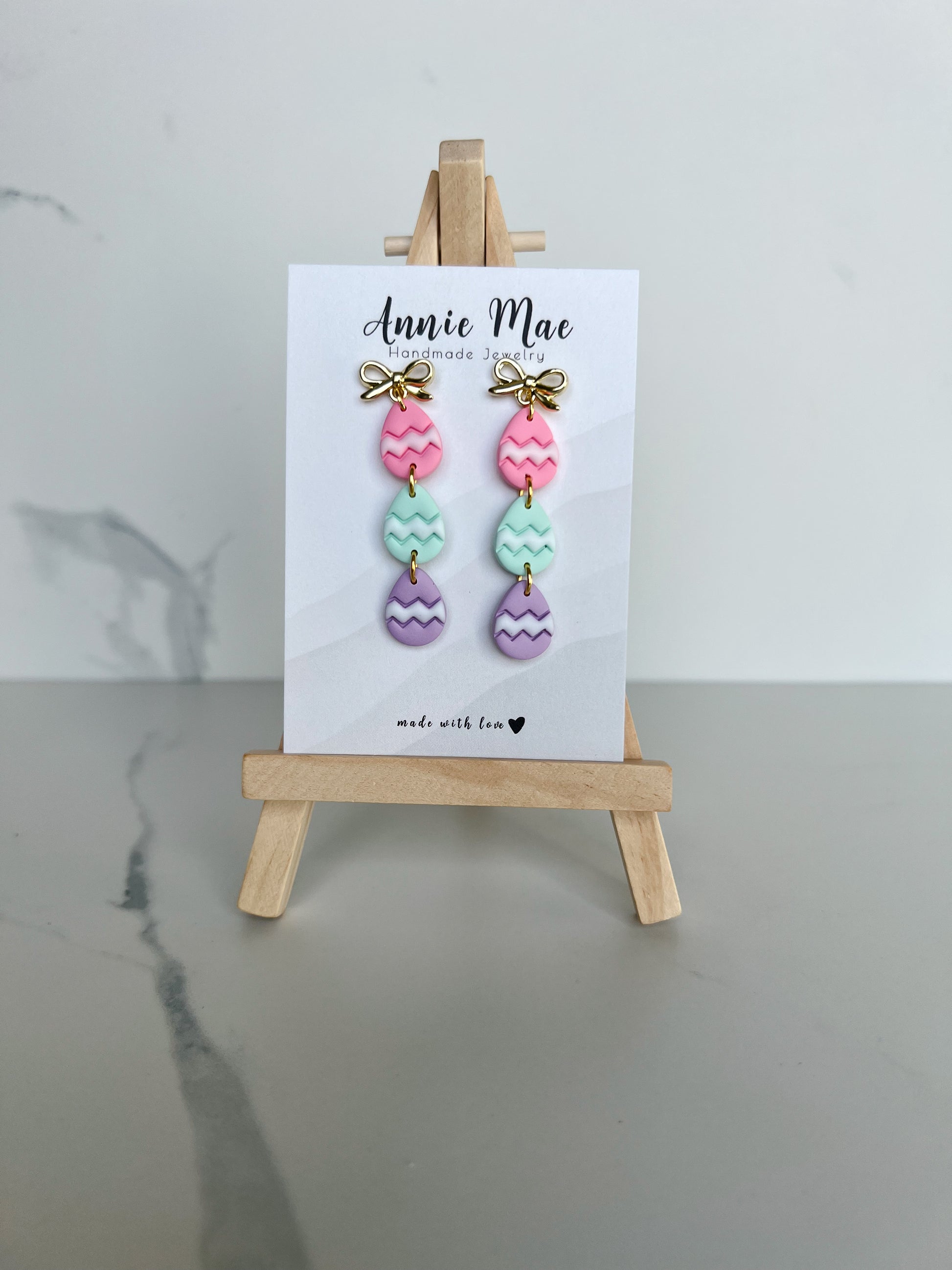 Pink, mint, and purple decorated Easter eggs hanging in a trio from a cute gold bow post.