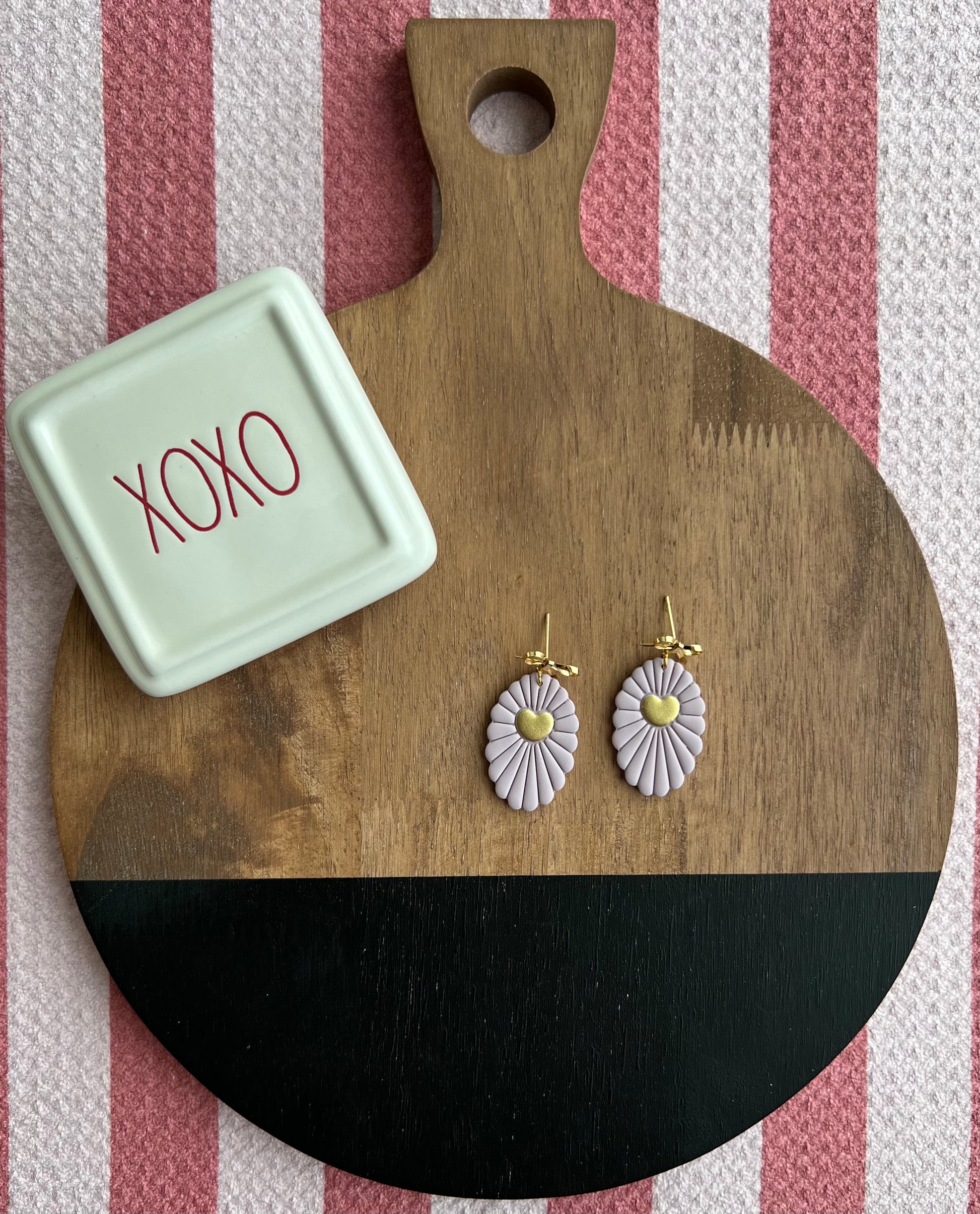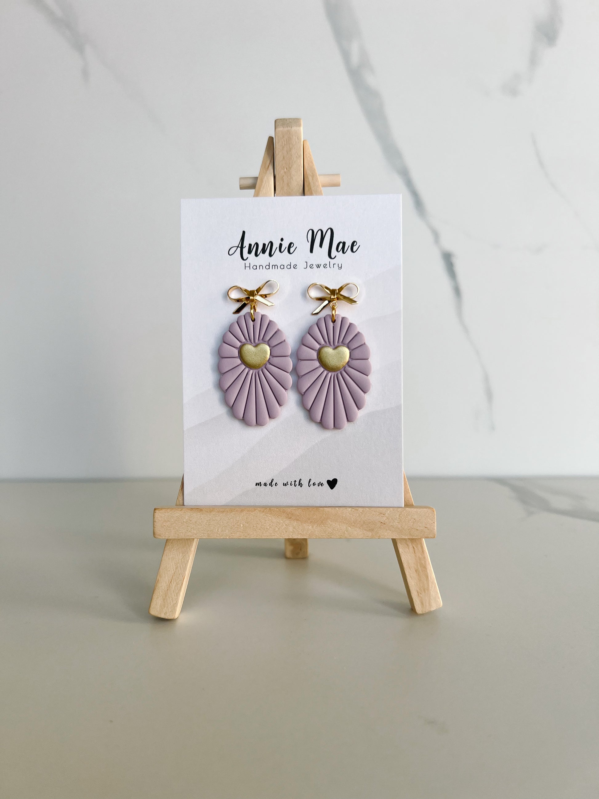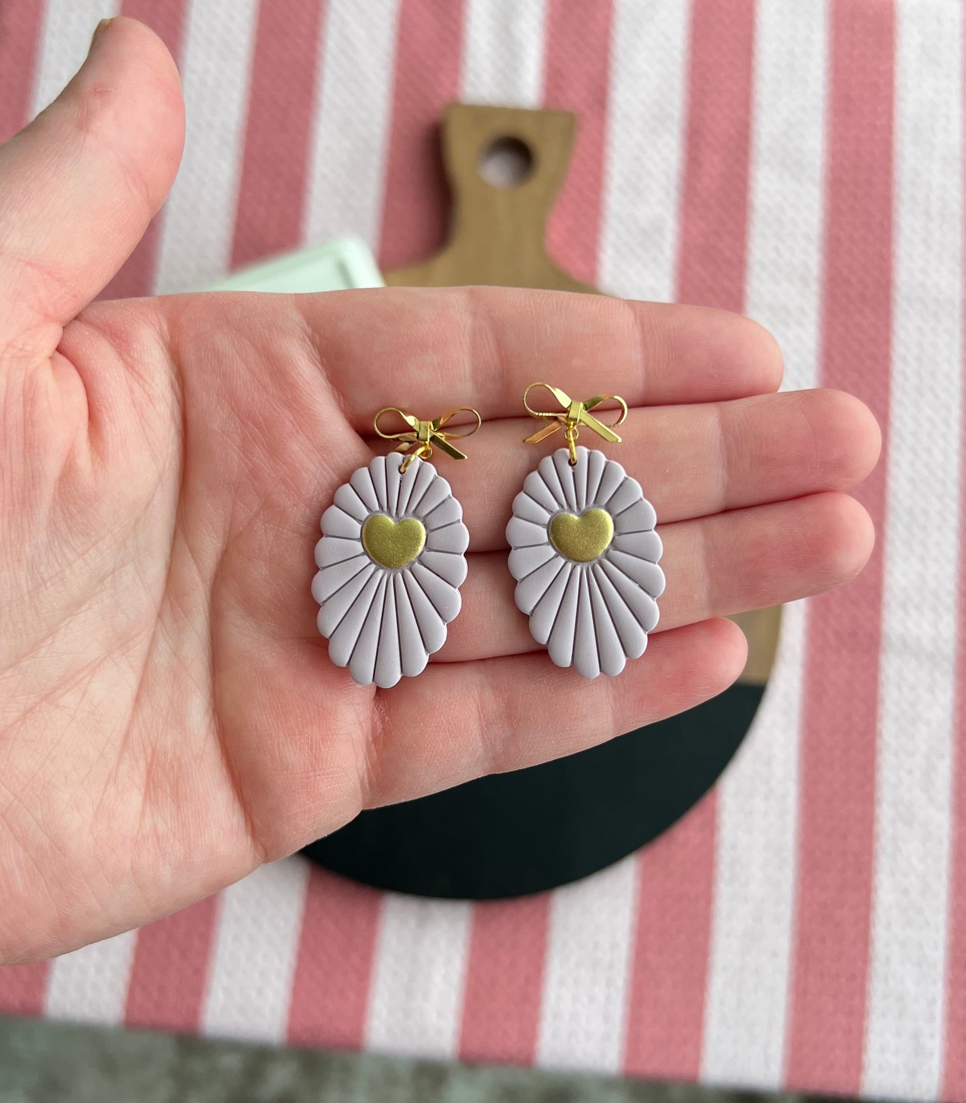 A light purple scalloped oval embossed sun ray design with a gold painted heart in the center. Hanging from a gold bow post.