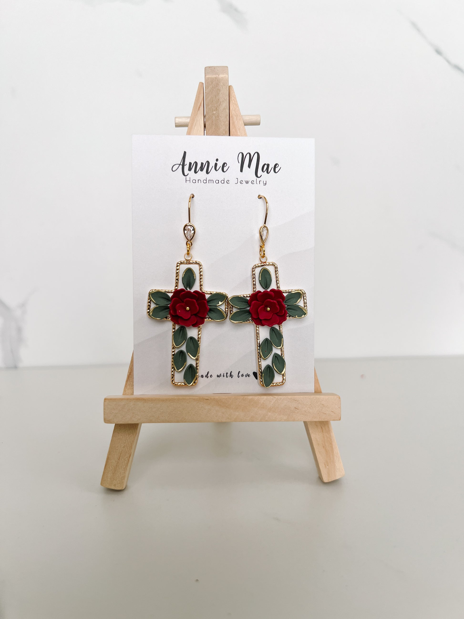 A beautiful charm bordered cross in a white background with beautiful hand crafted flowers and leaves. With gold accents hanging from a gold fishhook with a tear drop clear crystal. Also available in silver, but the fishhook is plain. Check for that listing.