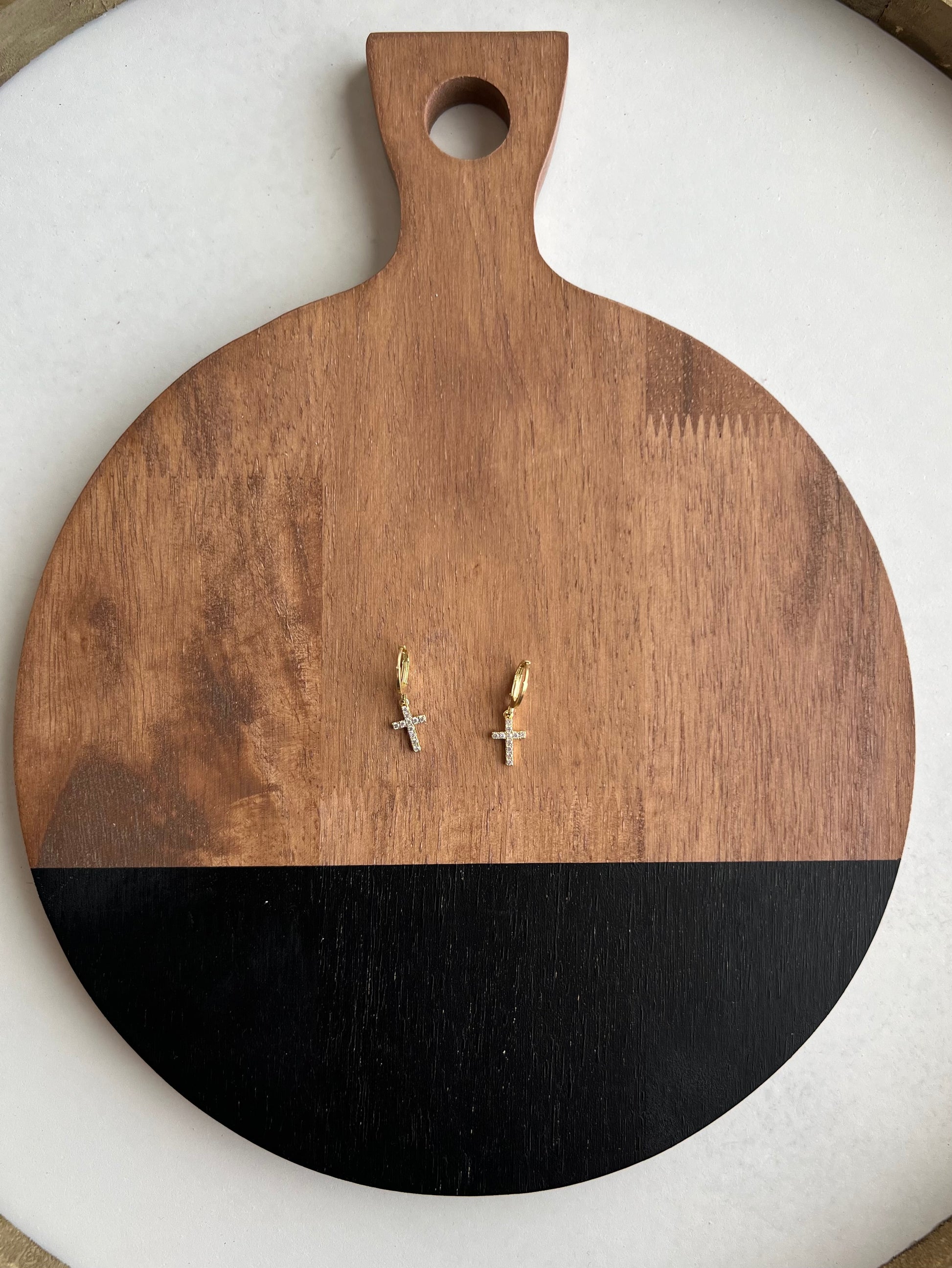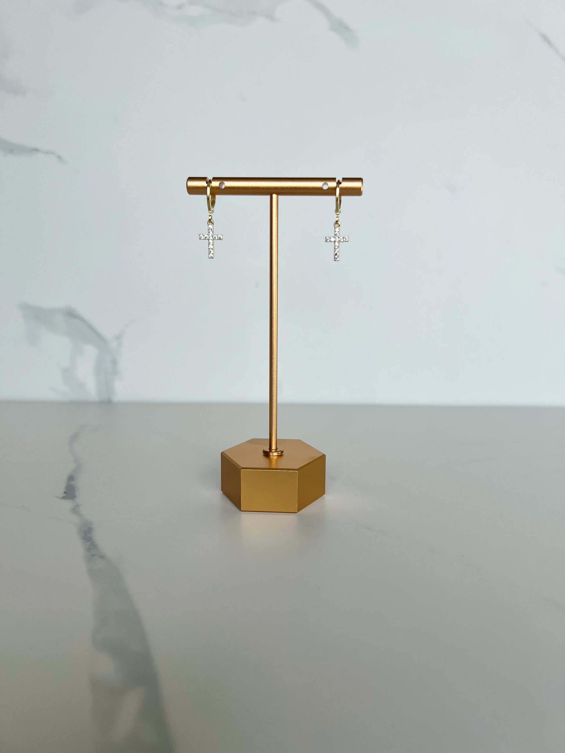 Dainty gold metal crosses with crystals, hanging from a gold huggie hoop.