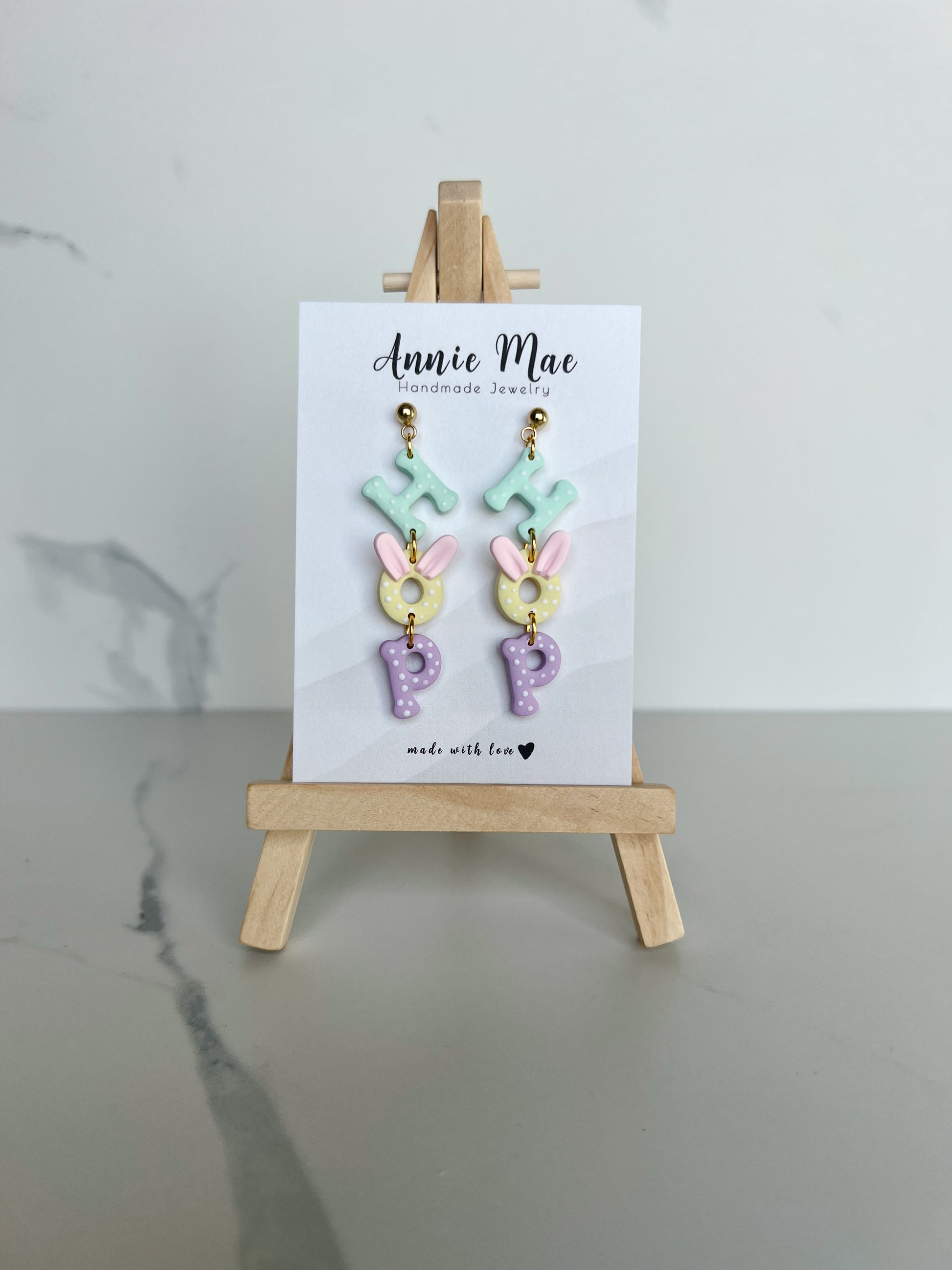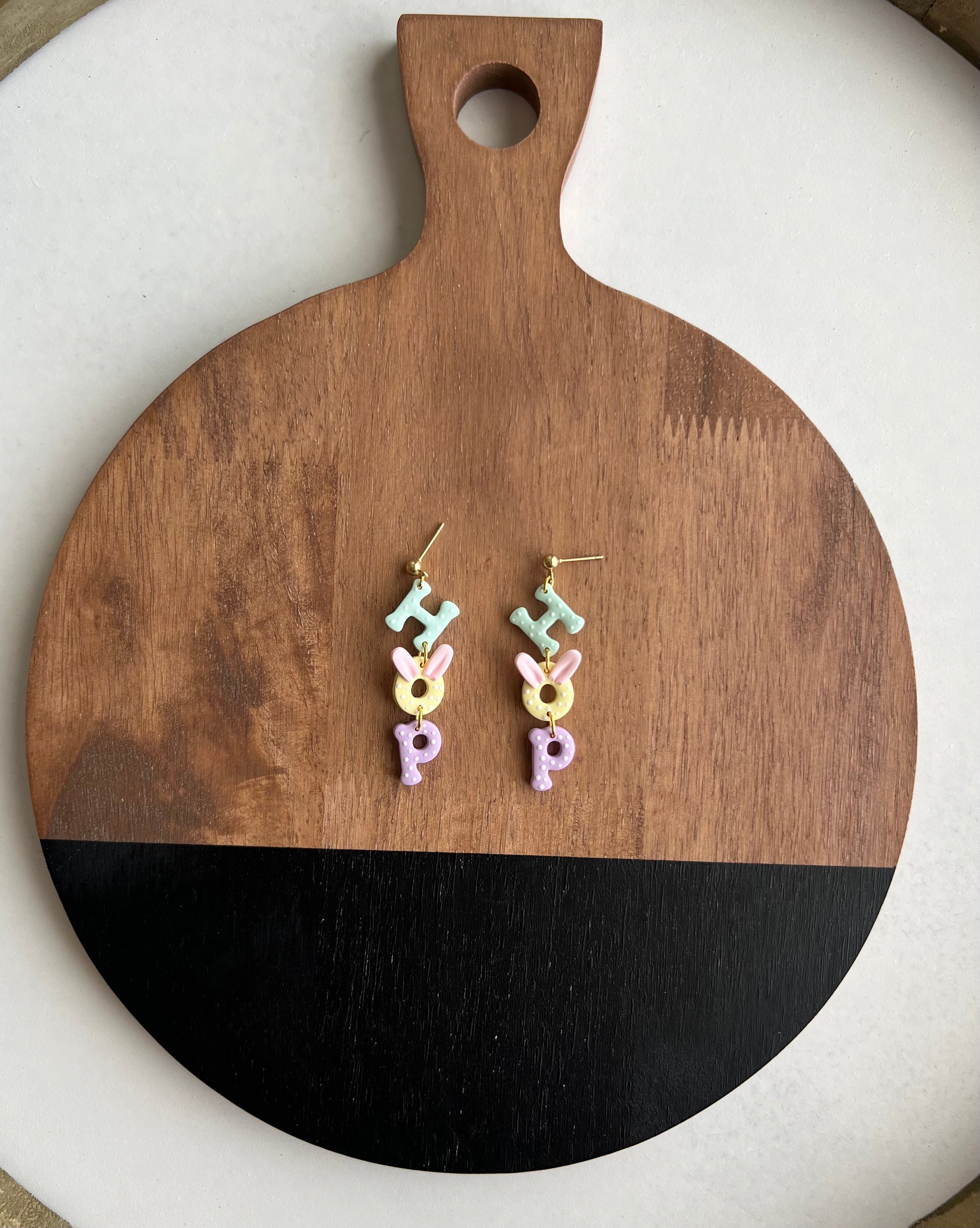 3 separate letters spelling “hop” in mint, yellow, and purple. All with white polka dots and the O has pink bunny ears. Hanging from gold ball posts.