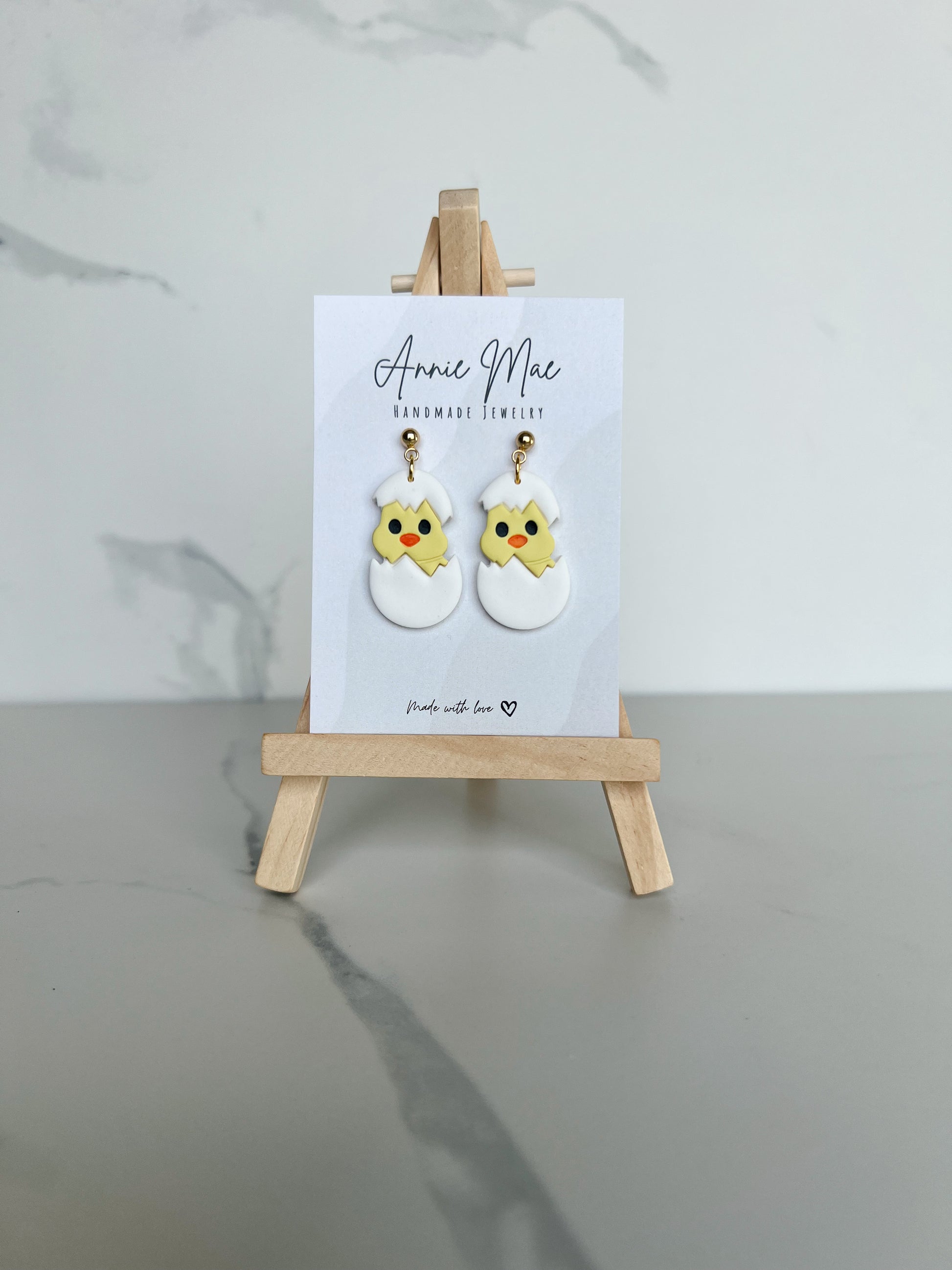 A hatching egg with a cute yellow chick with details on the face, hanging from a gold ball post.