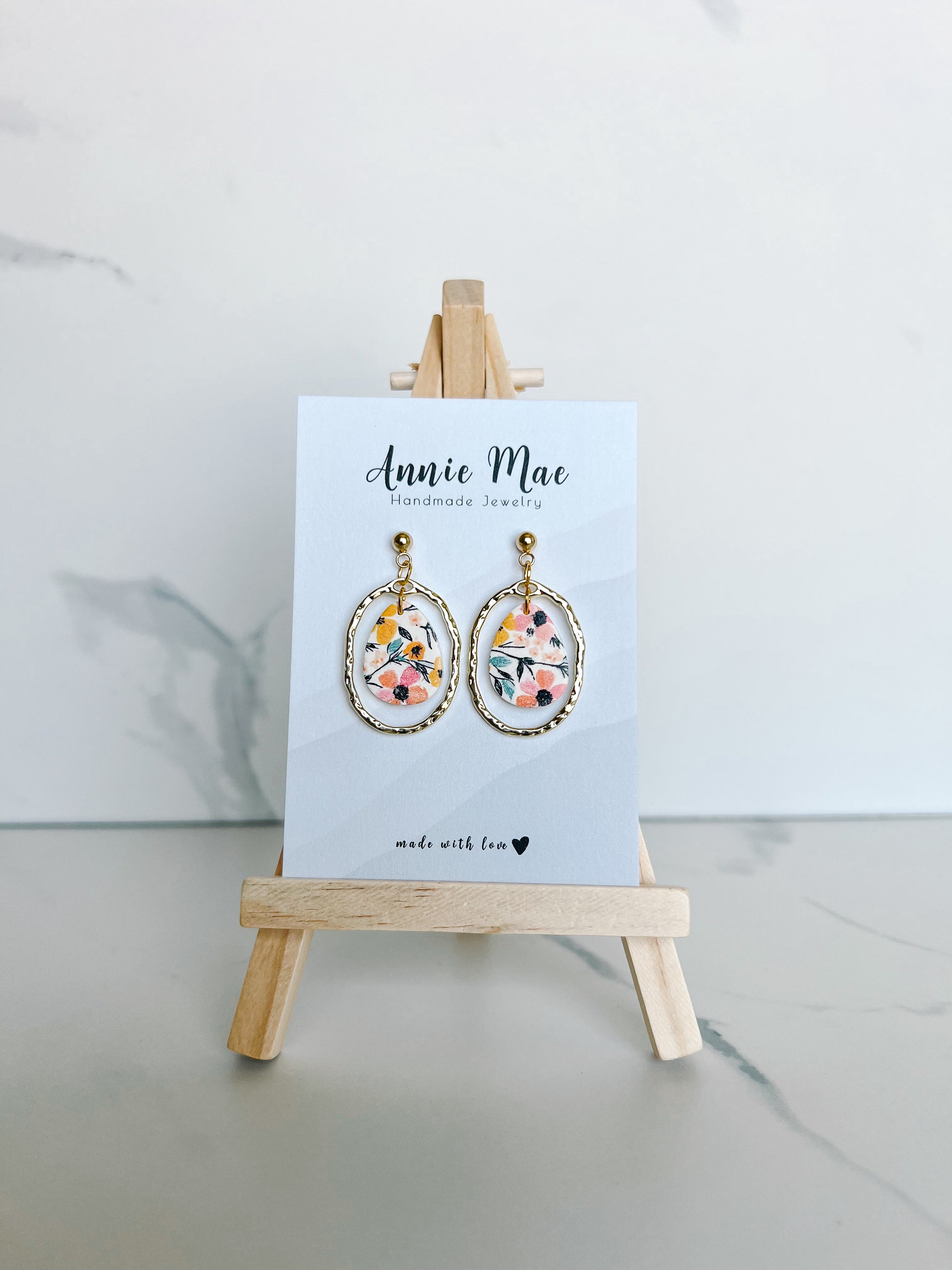 Beautiful spring floral patterned oval/egg shape hanging in a gold organic oval charm.