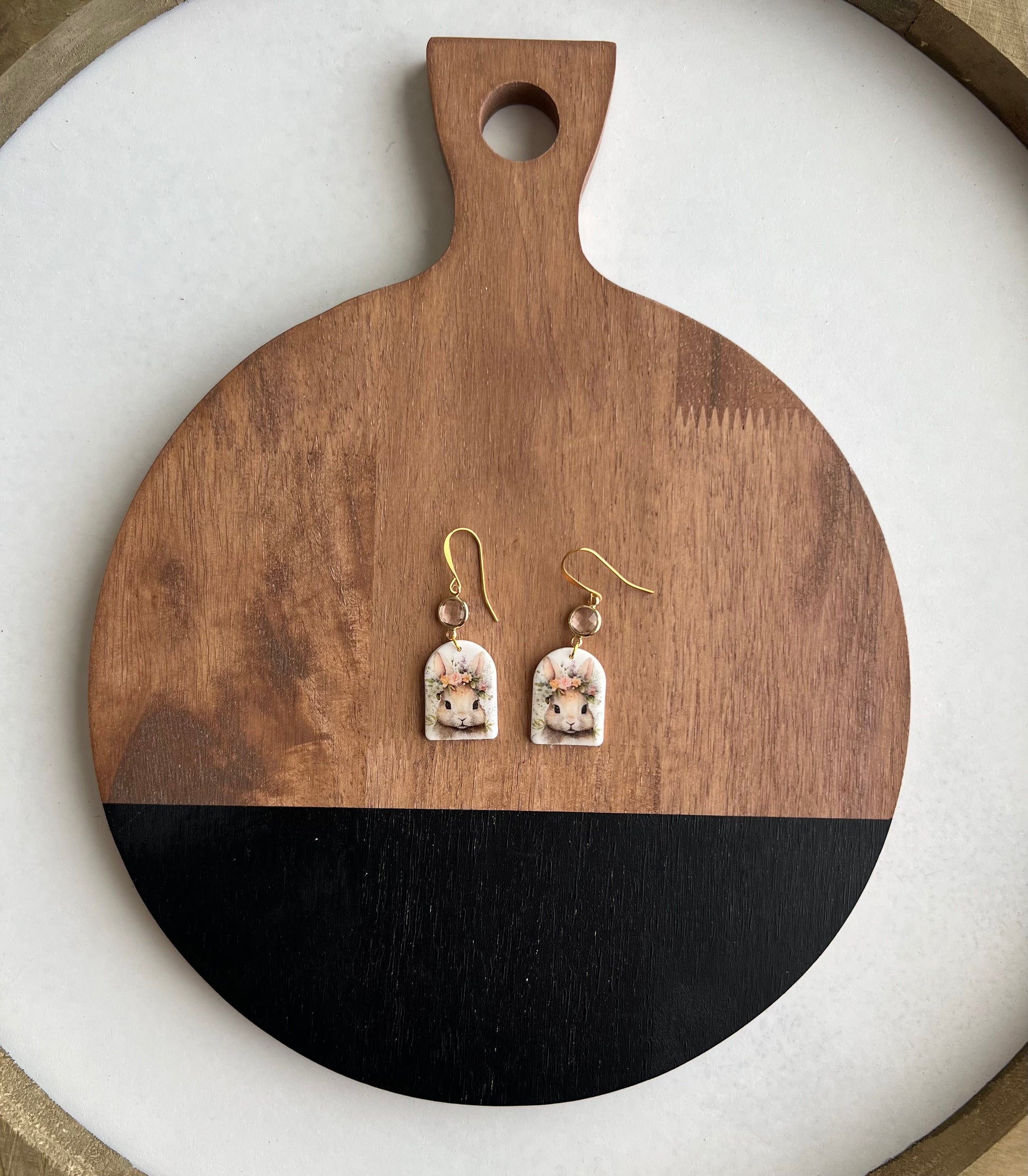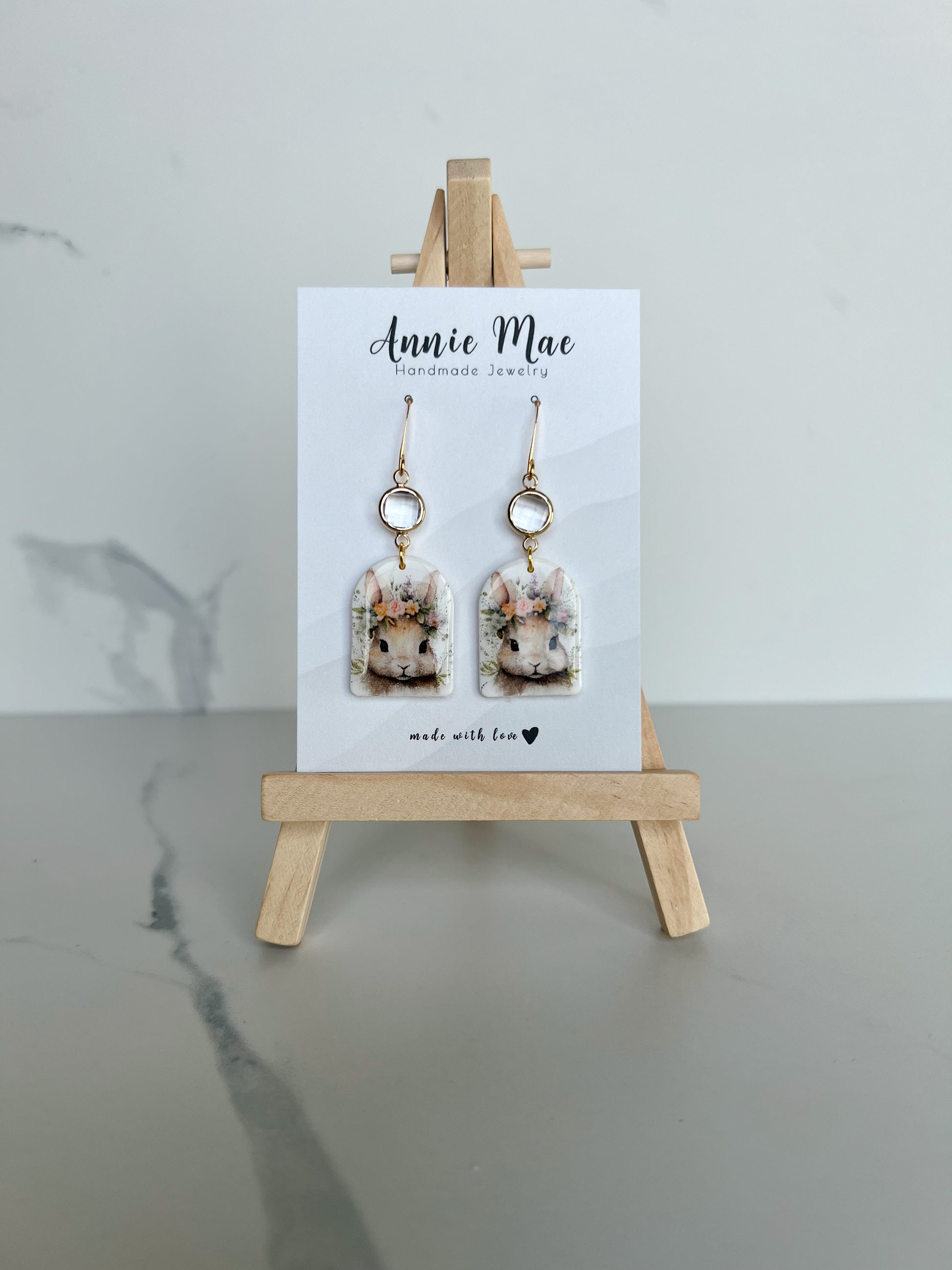 A simple arch shape with a spring bunny and floral print. Sealed with resin for shine and durability and hanging from a circle charm and fish hook.