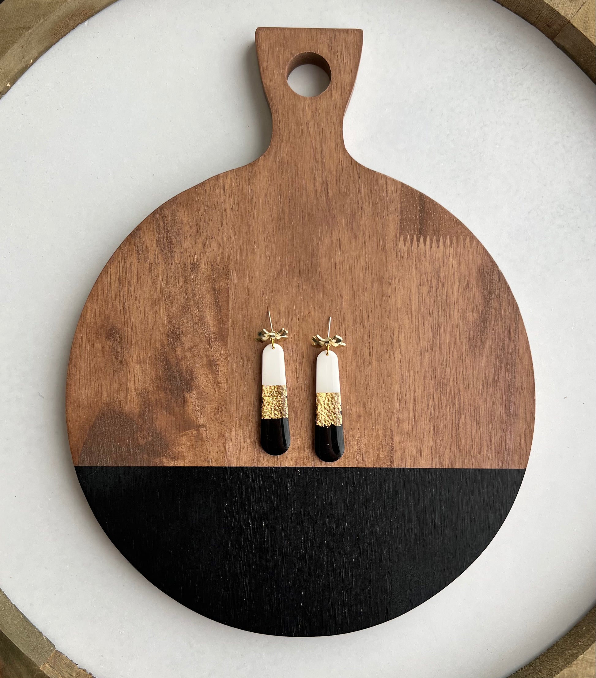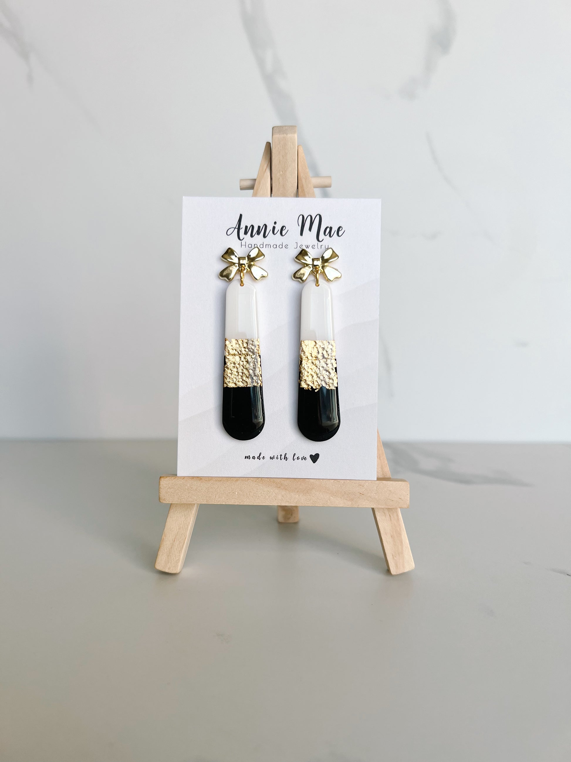 A Long skinny oval in white, black, and gold foil. Sealed with resin for shine and hanging from a cute gold bow post.
