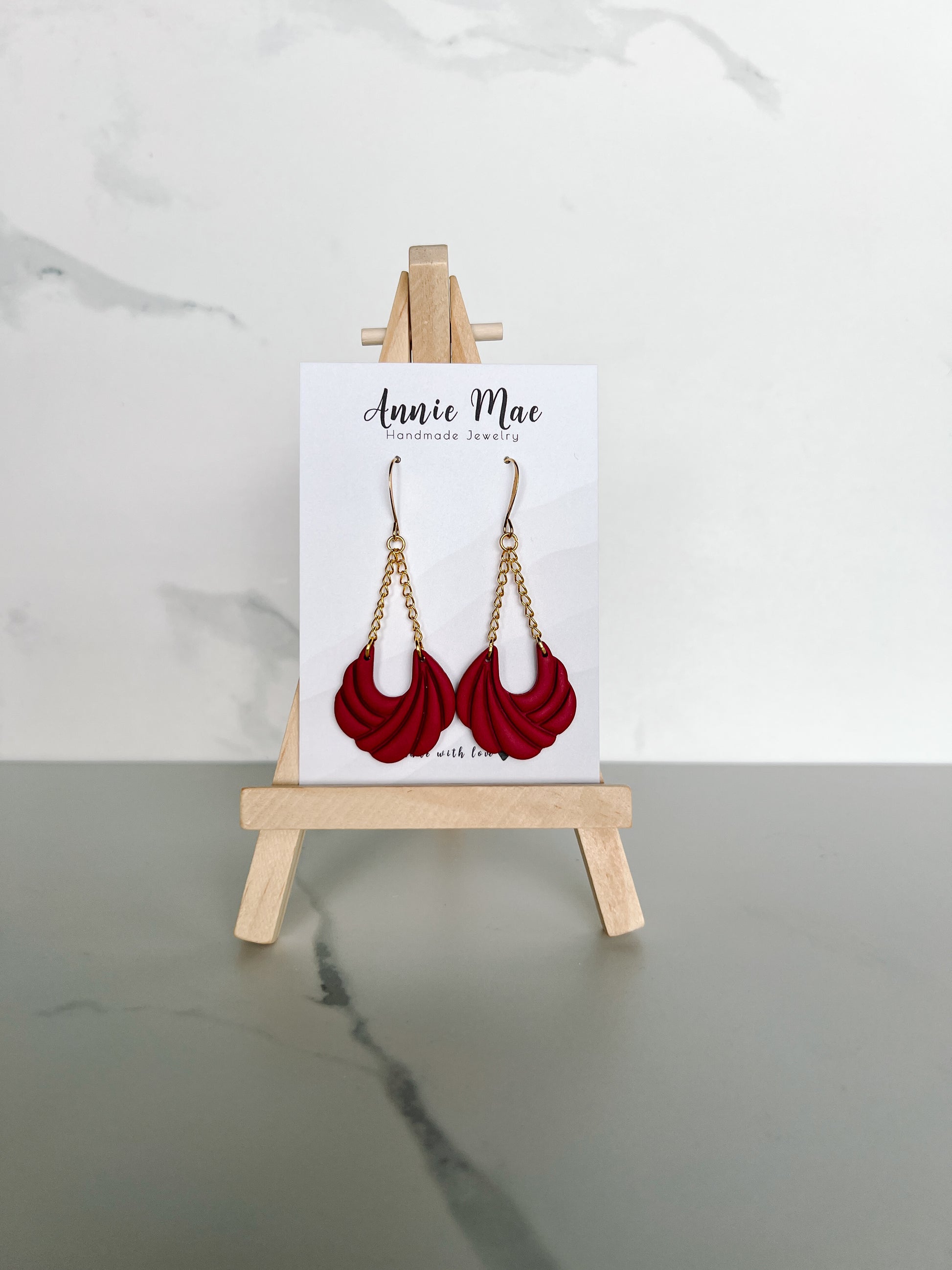 A pretty red embossed criss cross U shape, hanging from chain and a fish hook. Also available in silver if you ask!