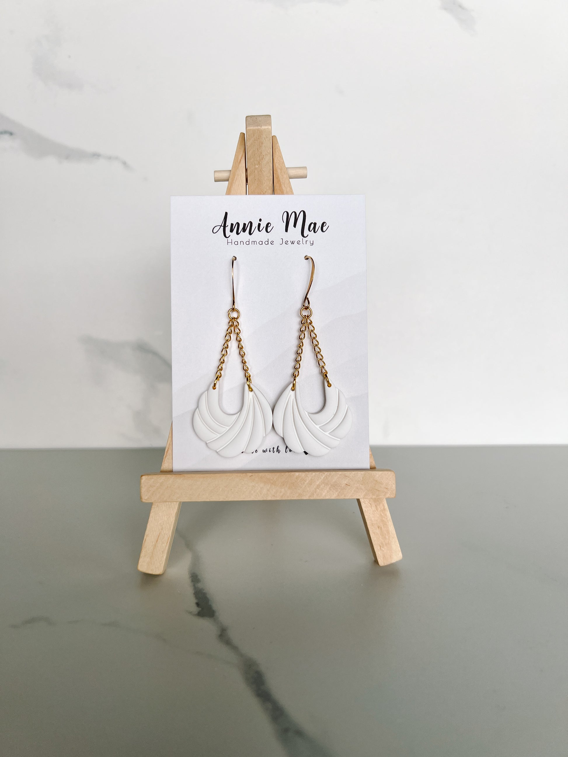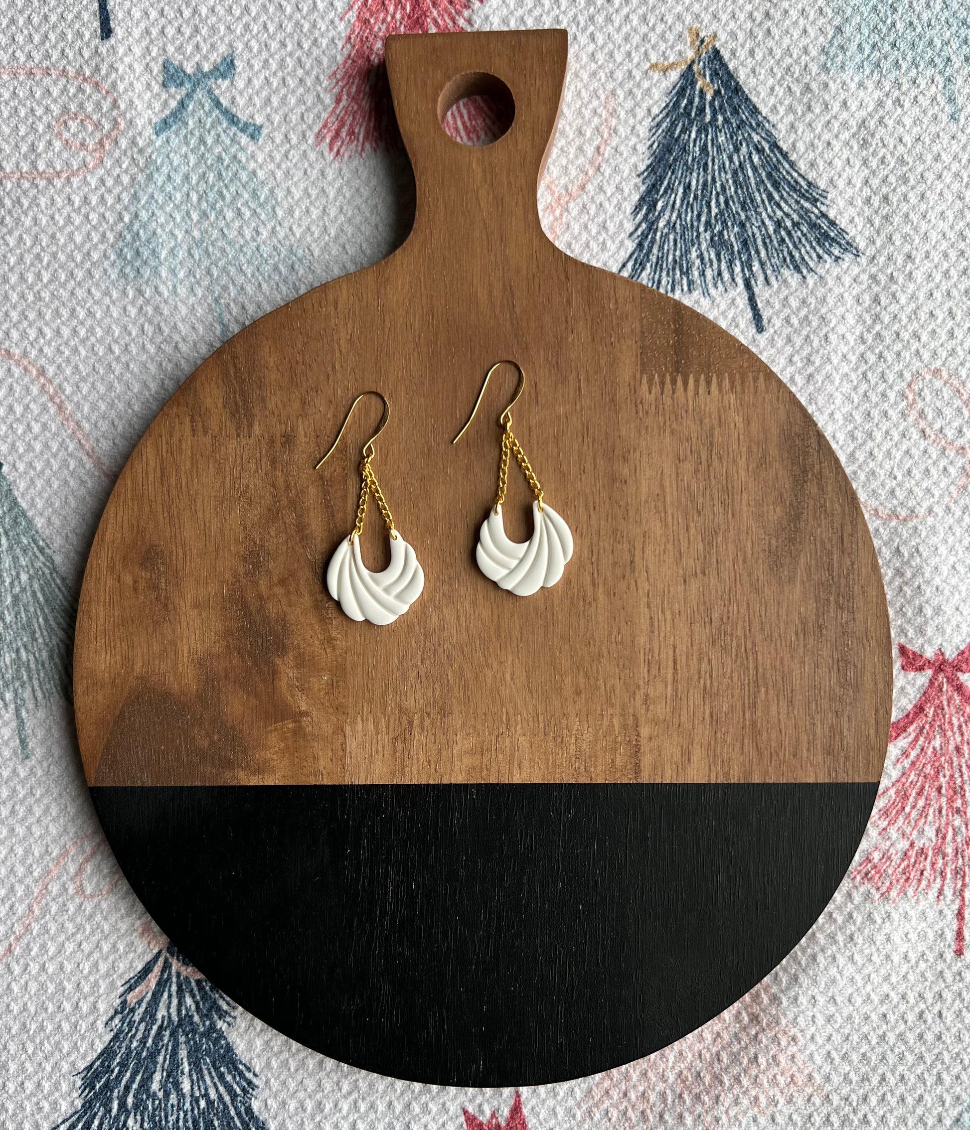 A pretty white embossed criss cross U shape, hanging from chain and a fish hook. Also available in silver if you ask!