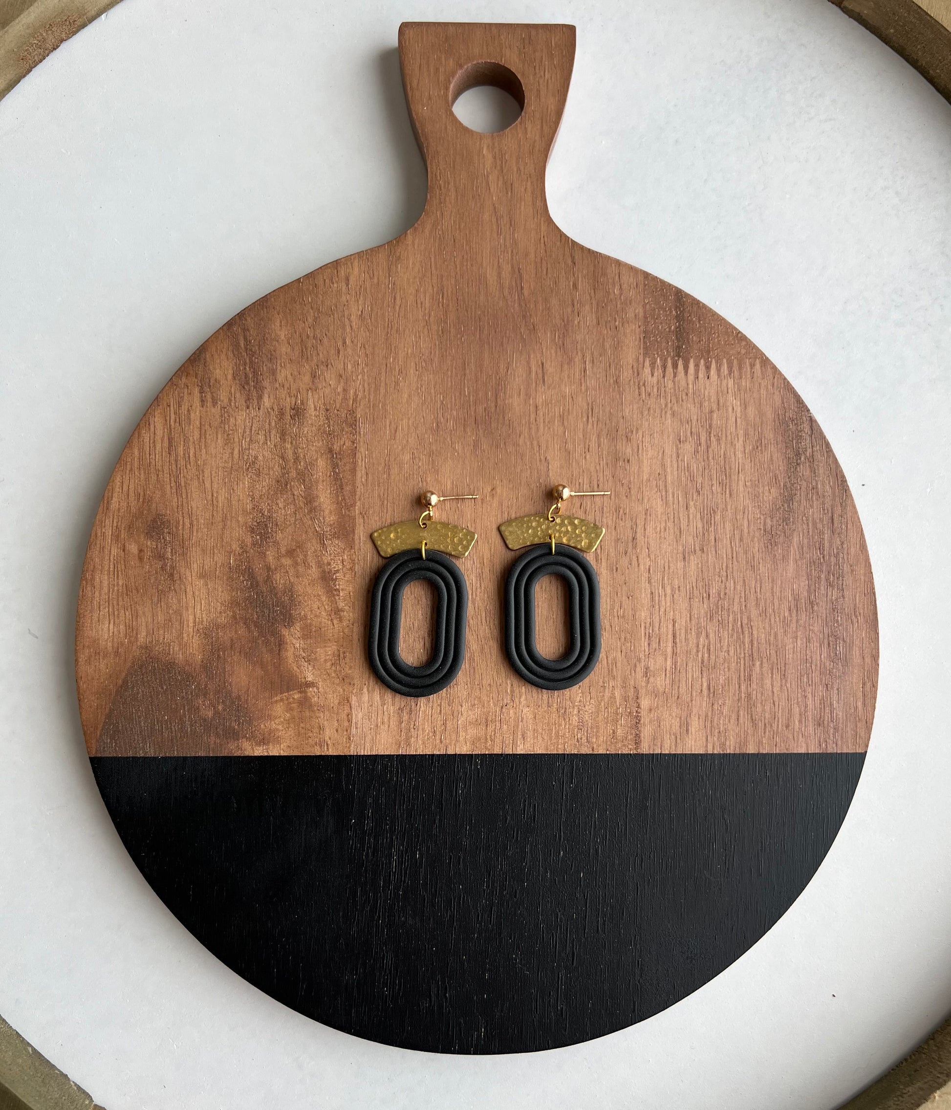 Black textured embossed oval with a brass arch charm.