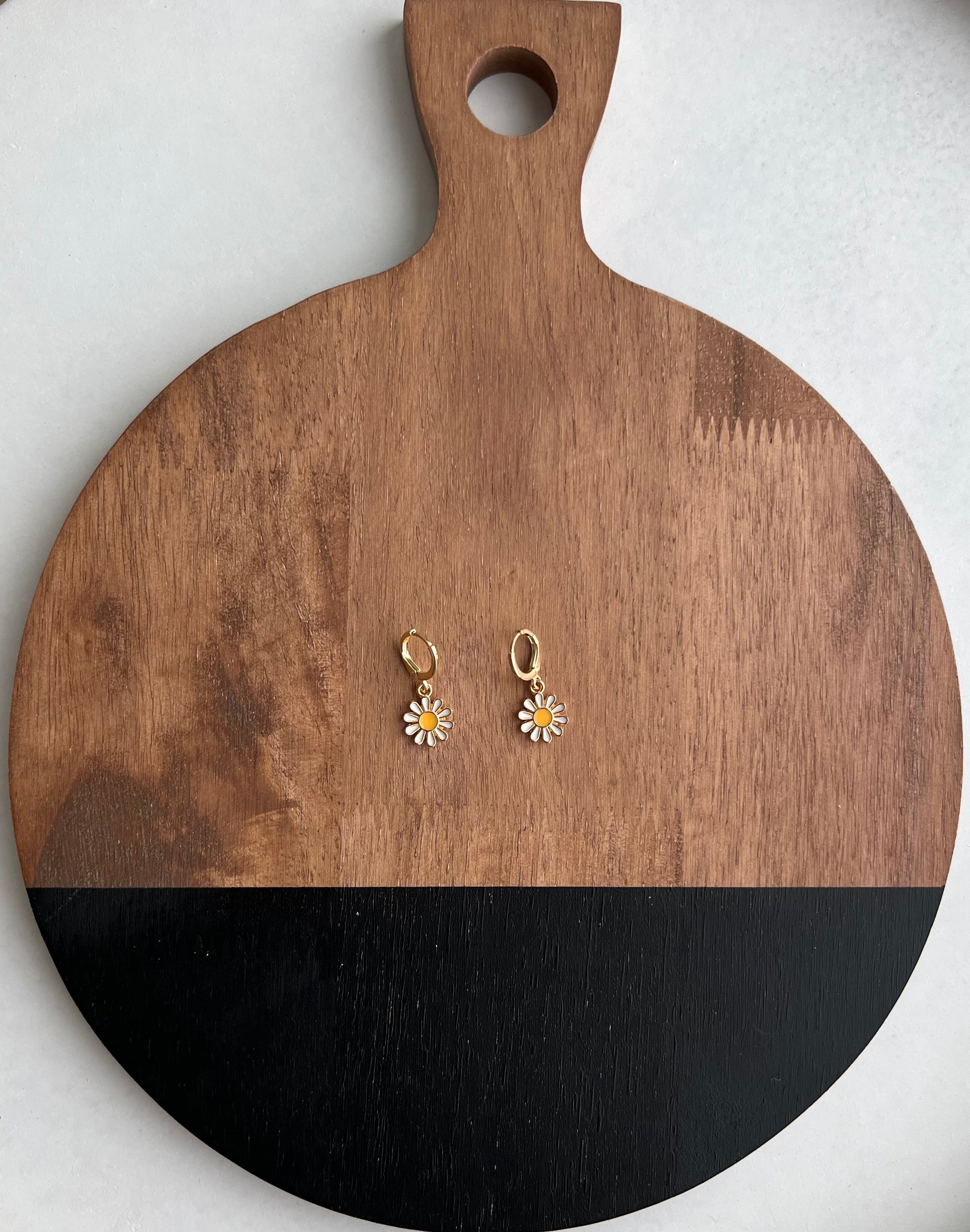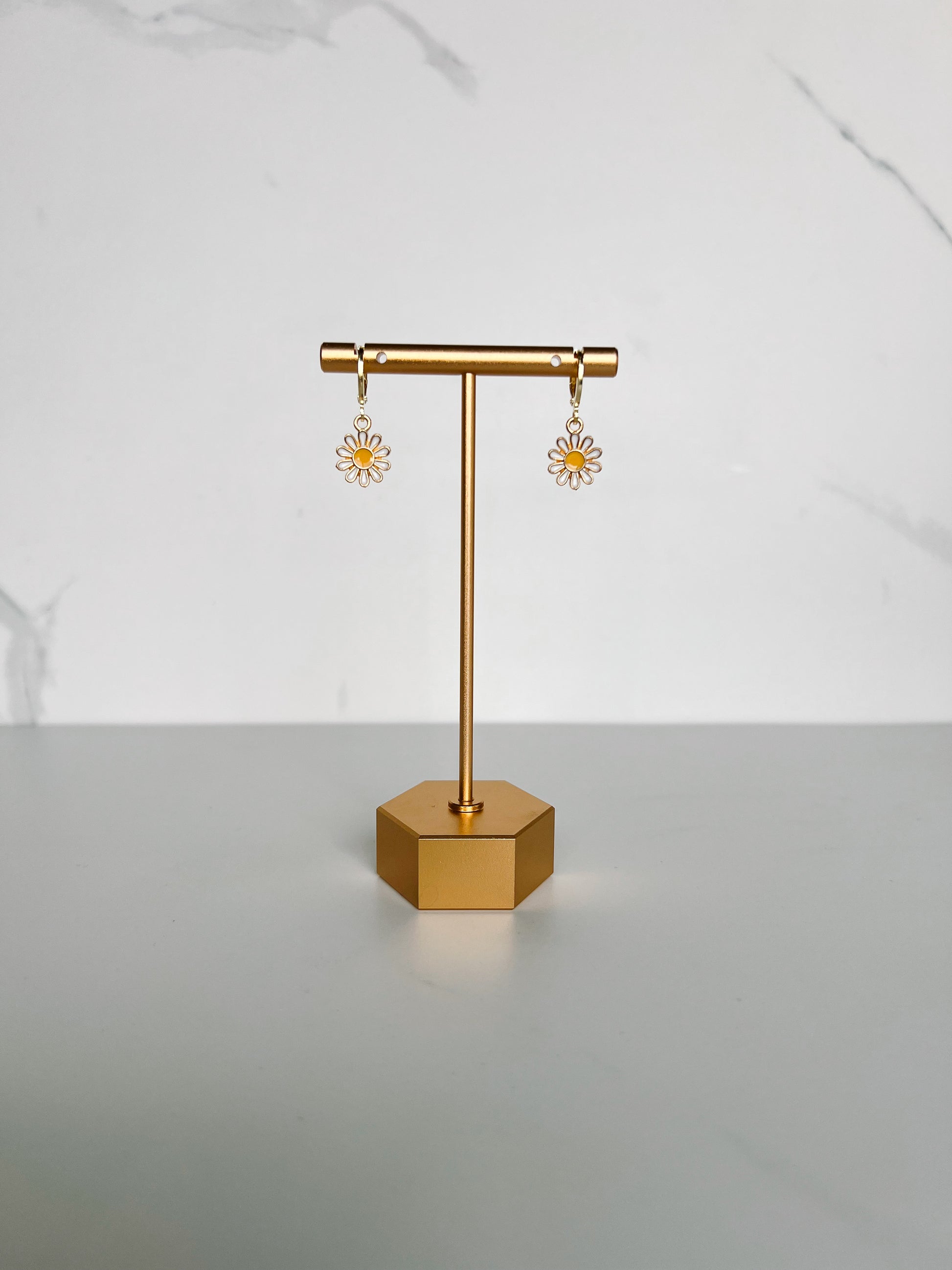 Gold and white metal daisies and a yellow center with a gold huggie hoop.