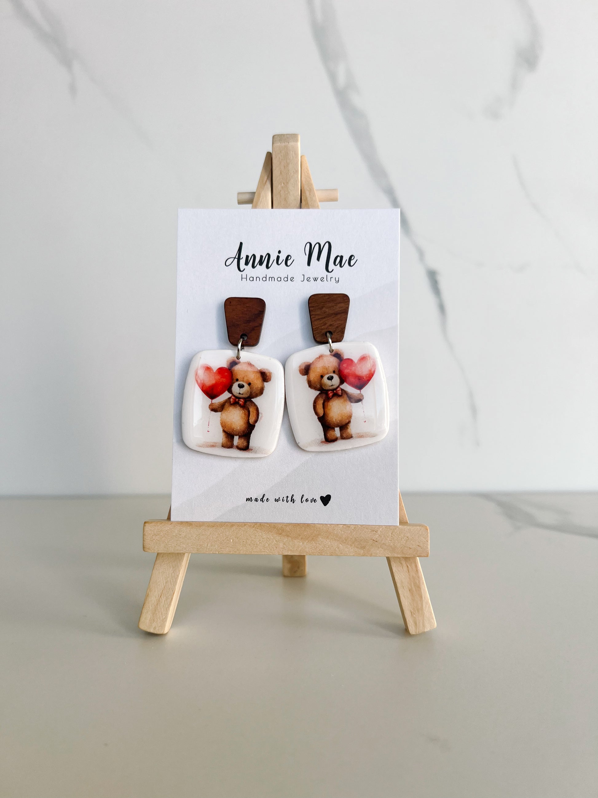 A cute teddy bear print on a rounder square shape with resin for shine hanging from a wooden post.