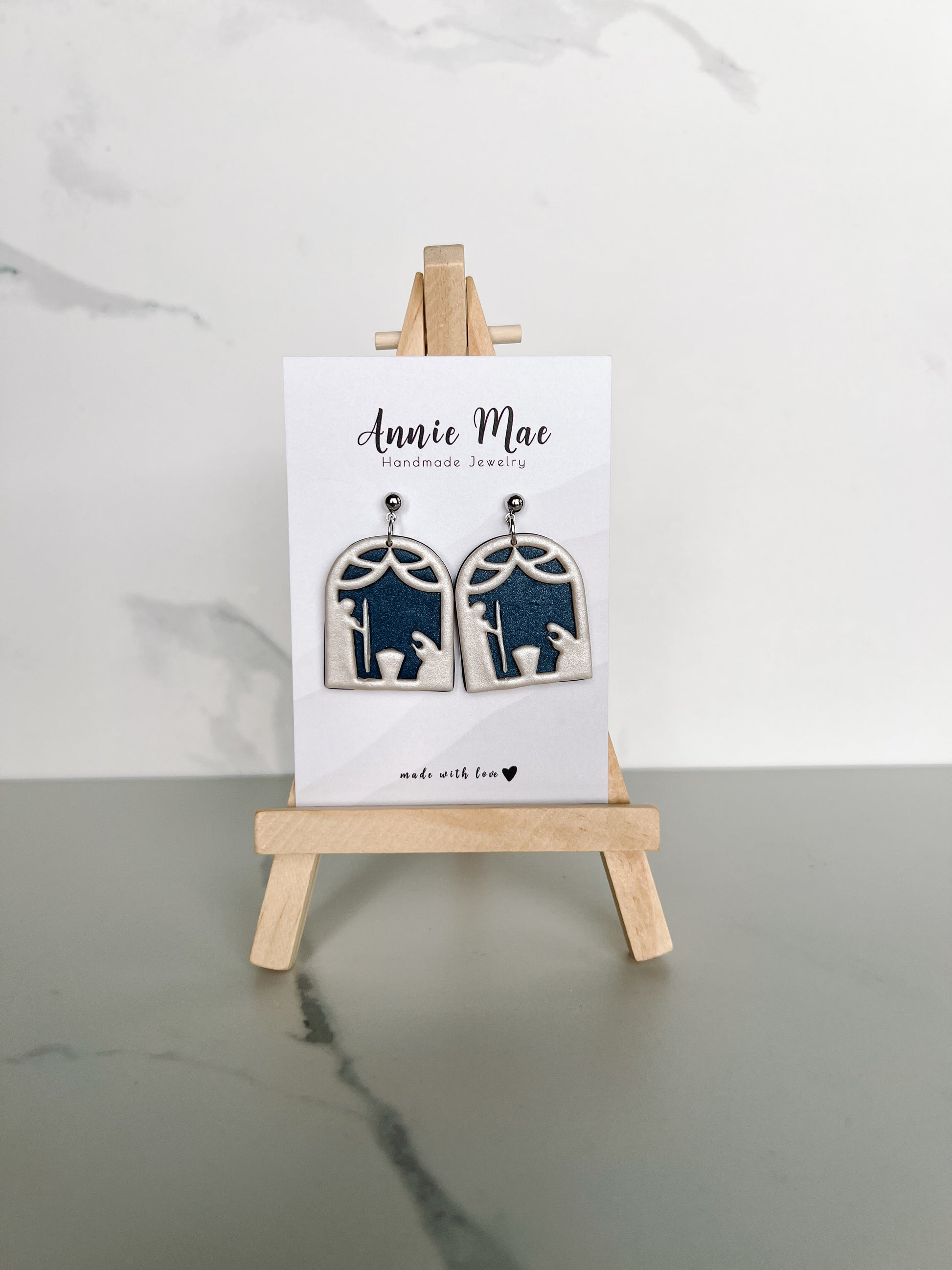 Shimmery dark blue background with a pearl shimmery white detailed / dainty nativity scene. Silver ball post but can also be done in gold.