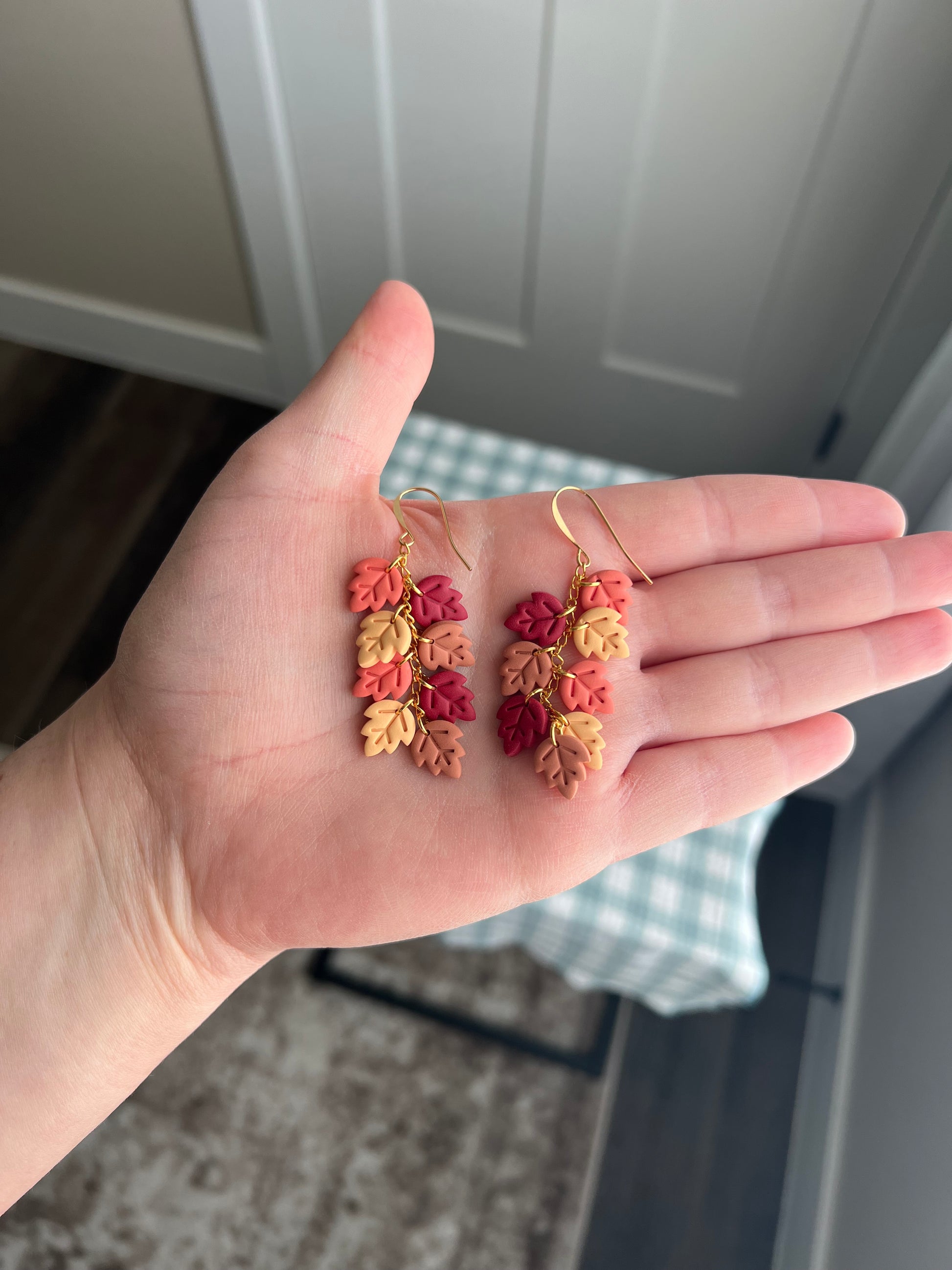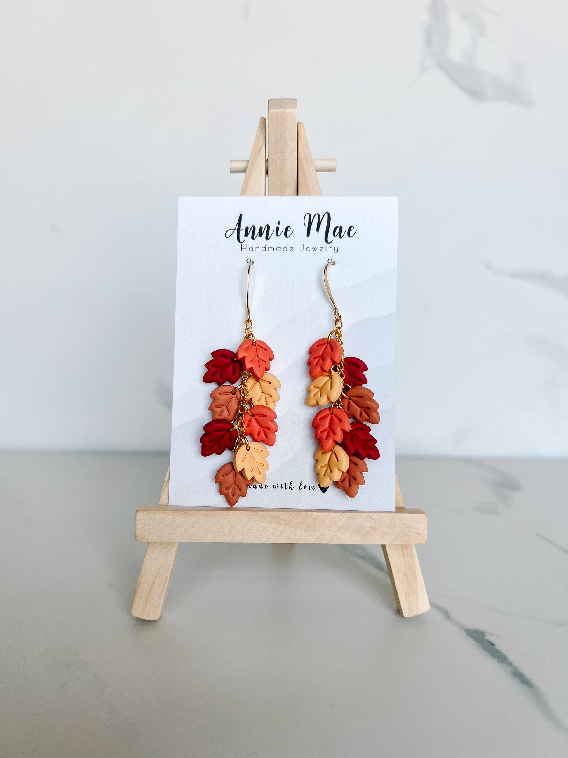Multicolored leaves hanging on a gold chain and fishhook. These move a lot so sometimes you may see the back of some leaves. Also available in silver