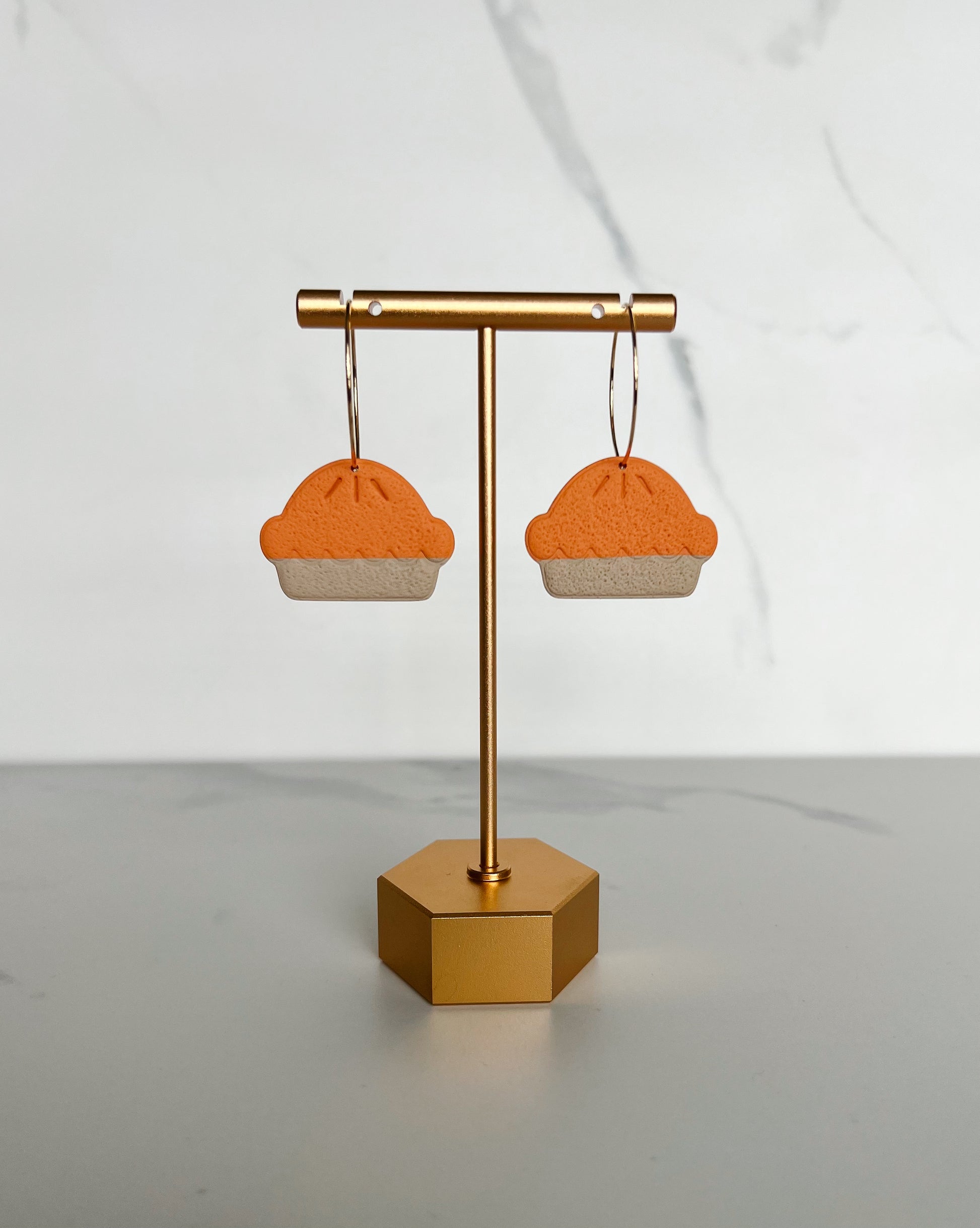 Cute textured orange pie with tan crust hanging on a hoop. Also available in silver, just put in the notes please!