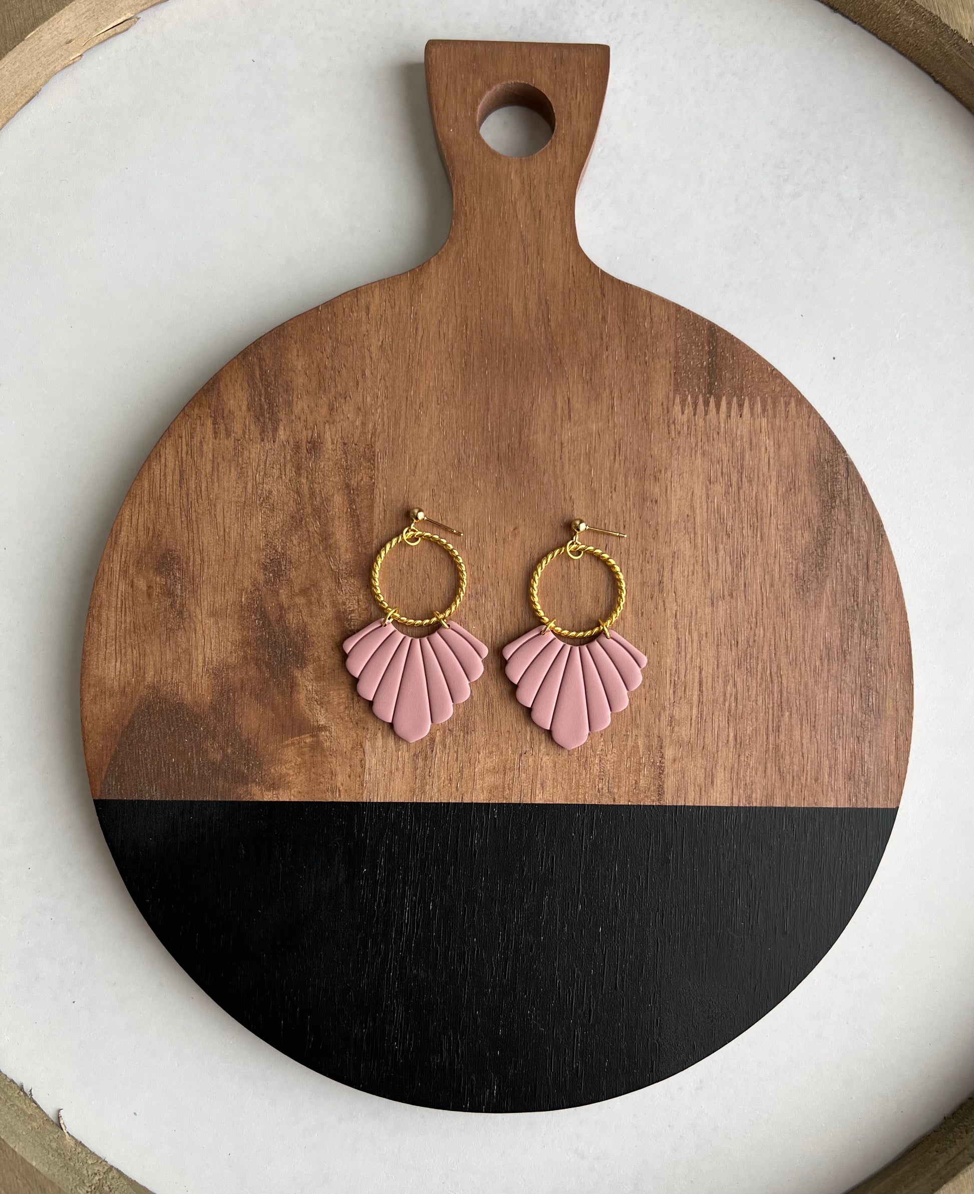 Dusty Pink scalloped embossed fan shape hanging from a textured brass circle.