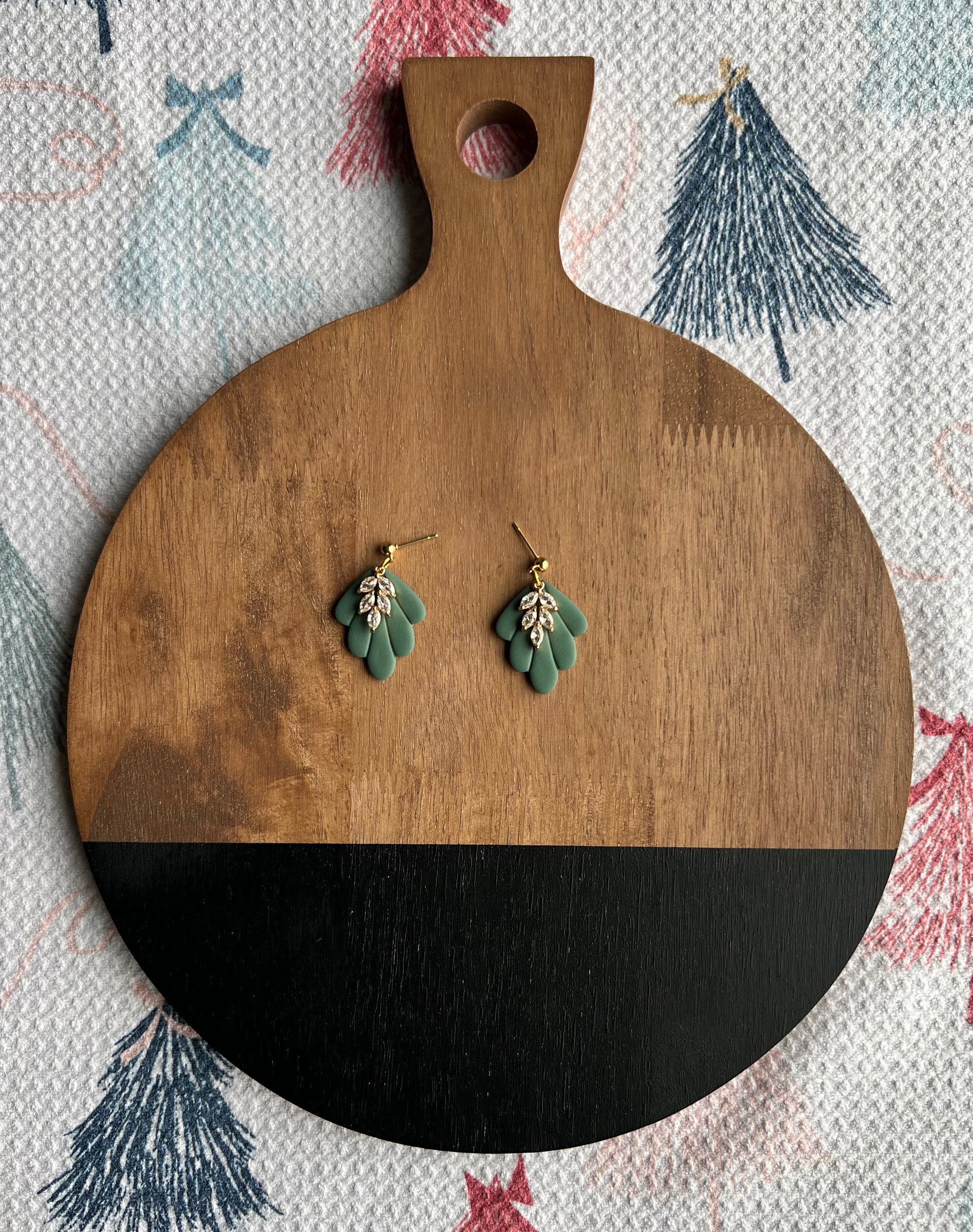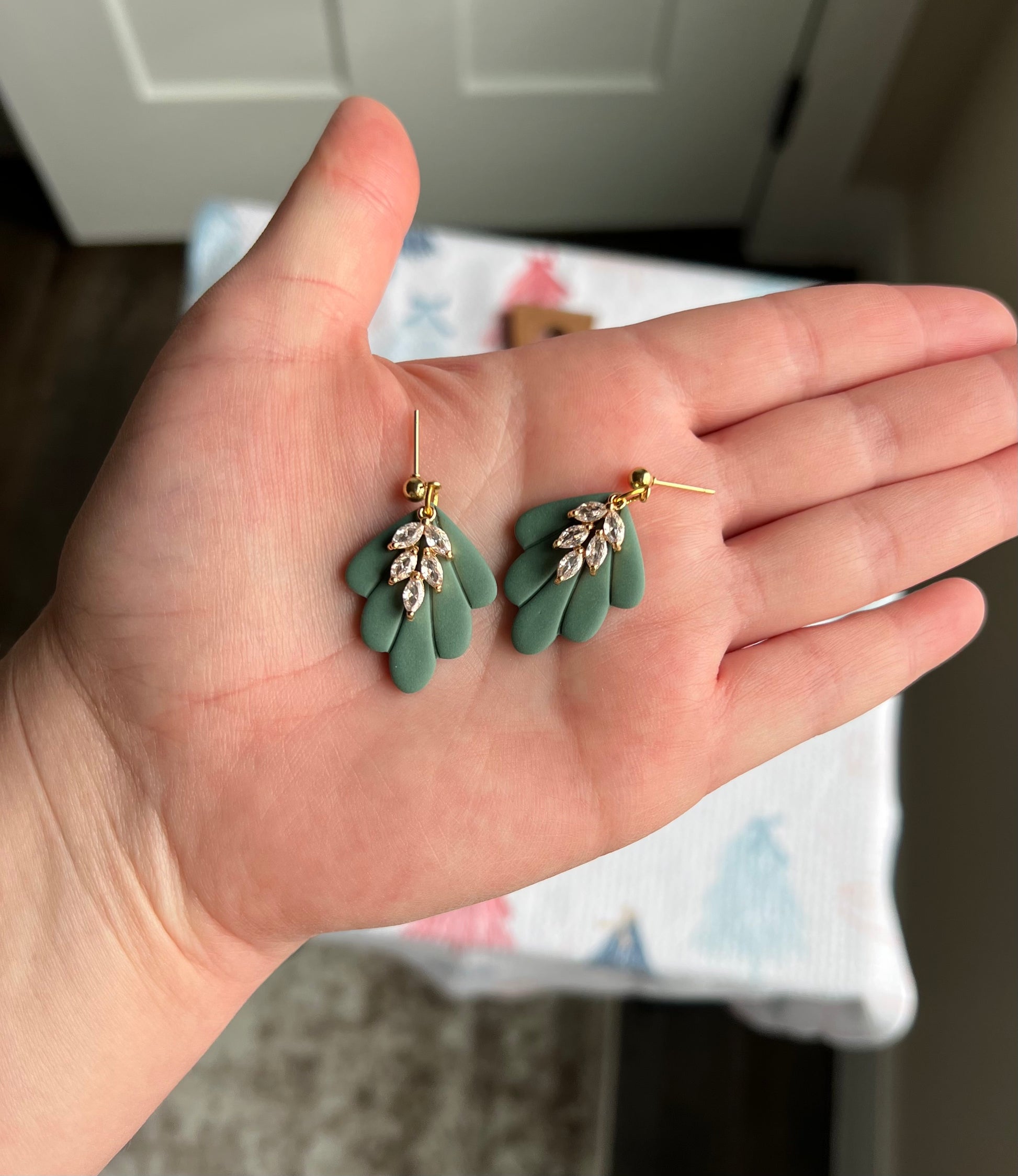 A Pretty green scalloped shape with a beautiful gold and crystal charm hanging from a gold ball post.