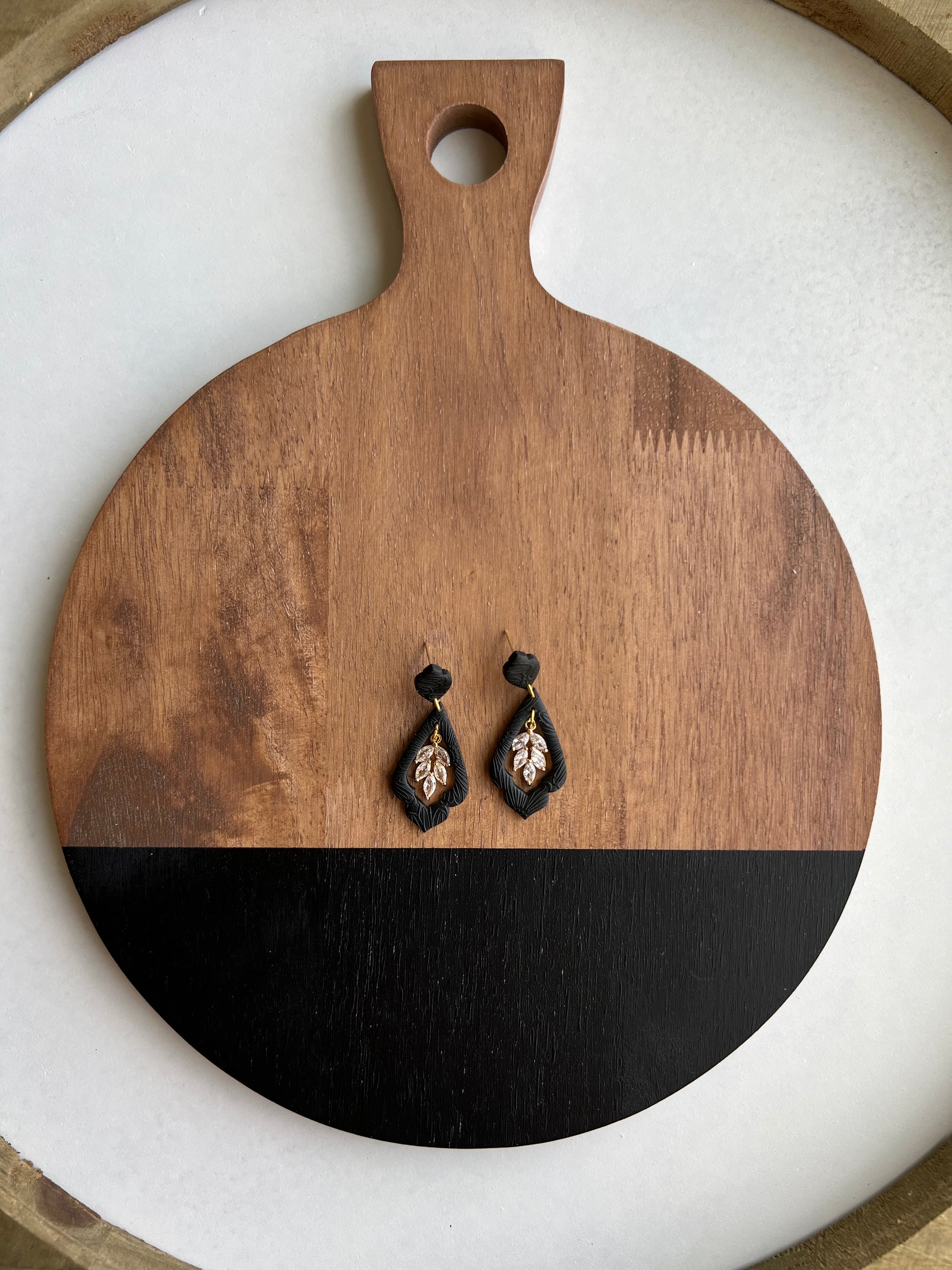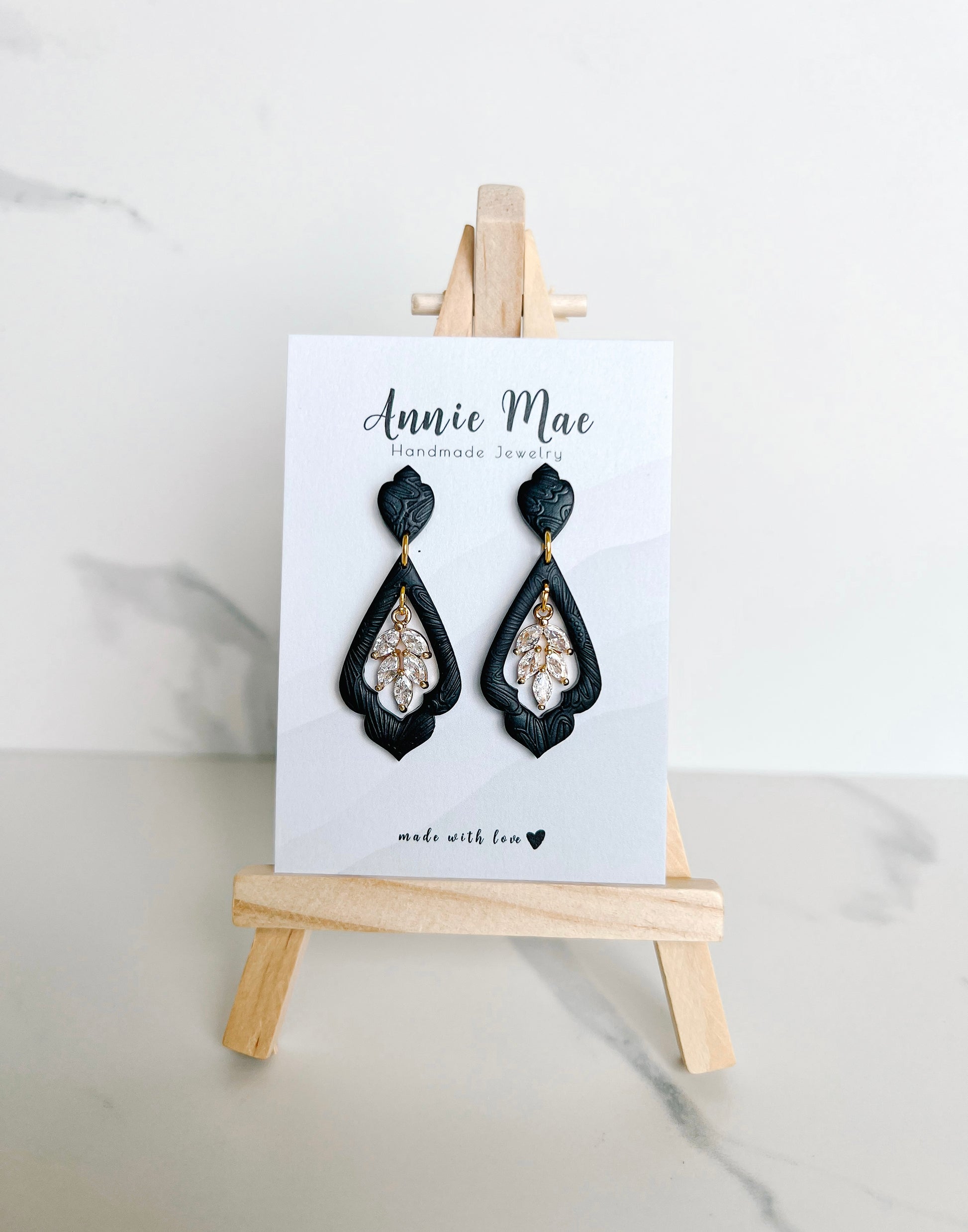 Black elegant shape with a pretty texture. I beautiful and sparkly charm hanging in the center. Stud back is secured with resin.