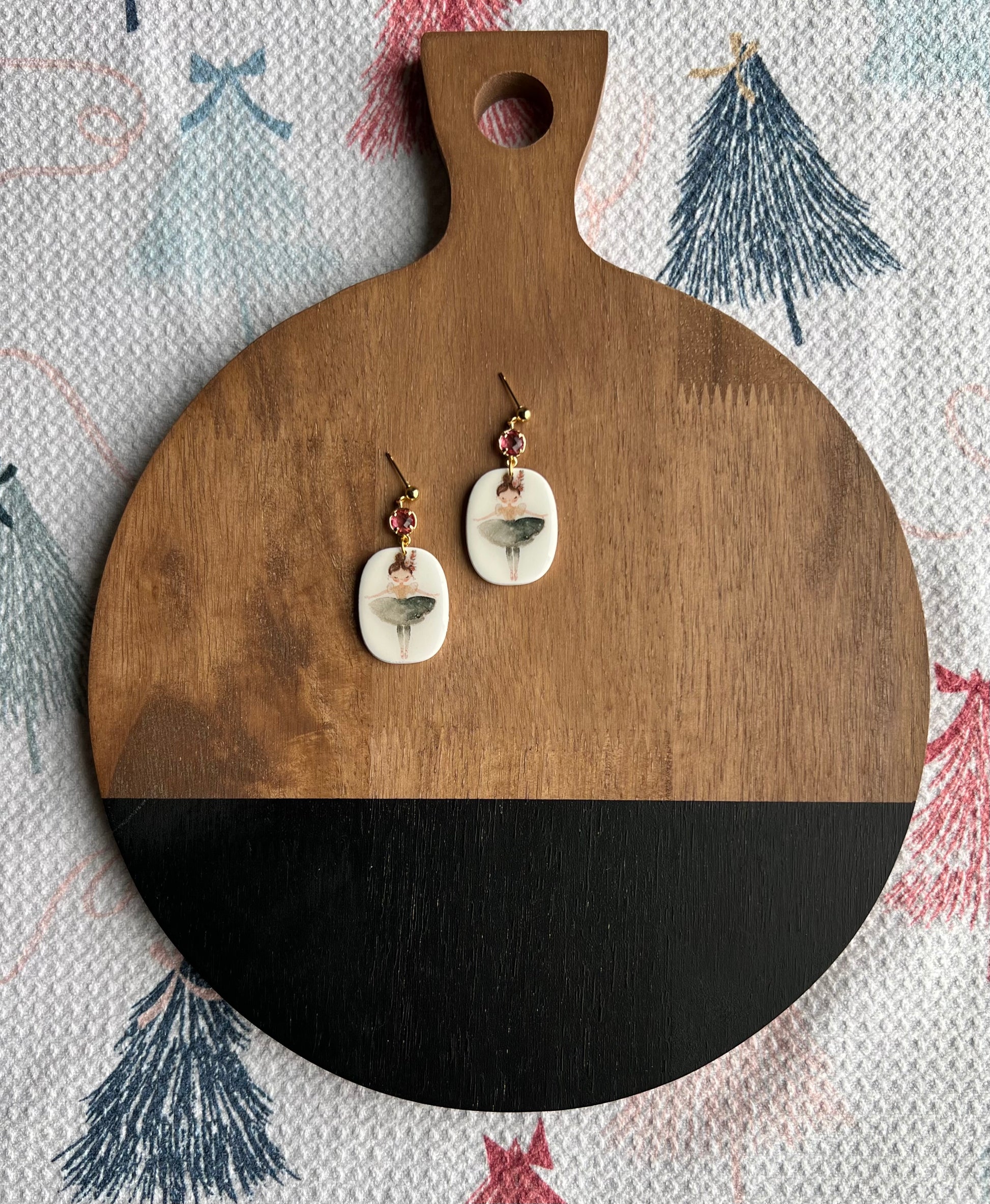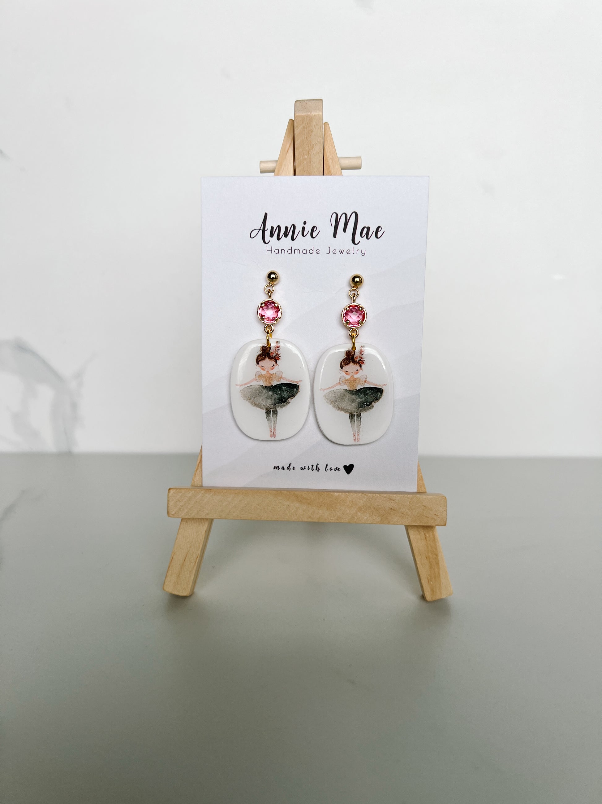 A fun rounded rectangle shape with a cute ballerina print with resin for shine hanging from a pink circle charm and a ball post.